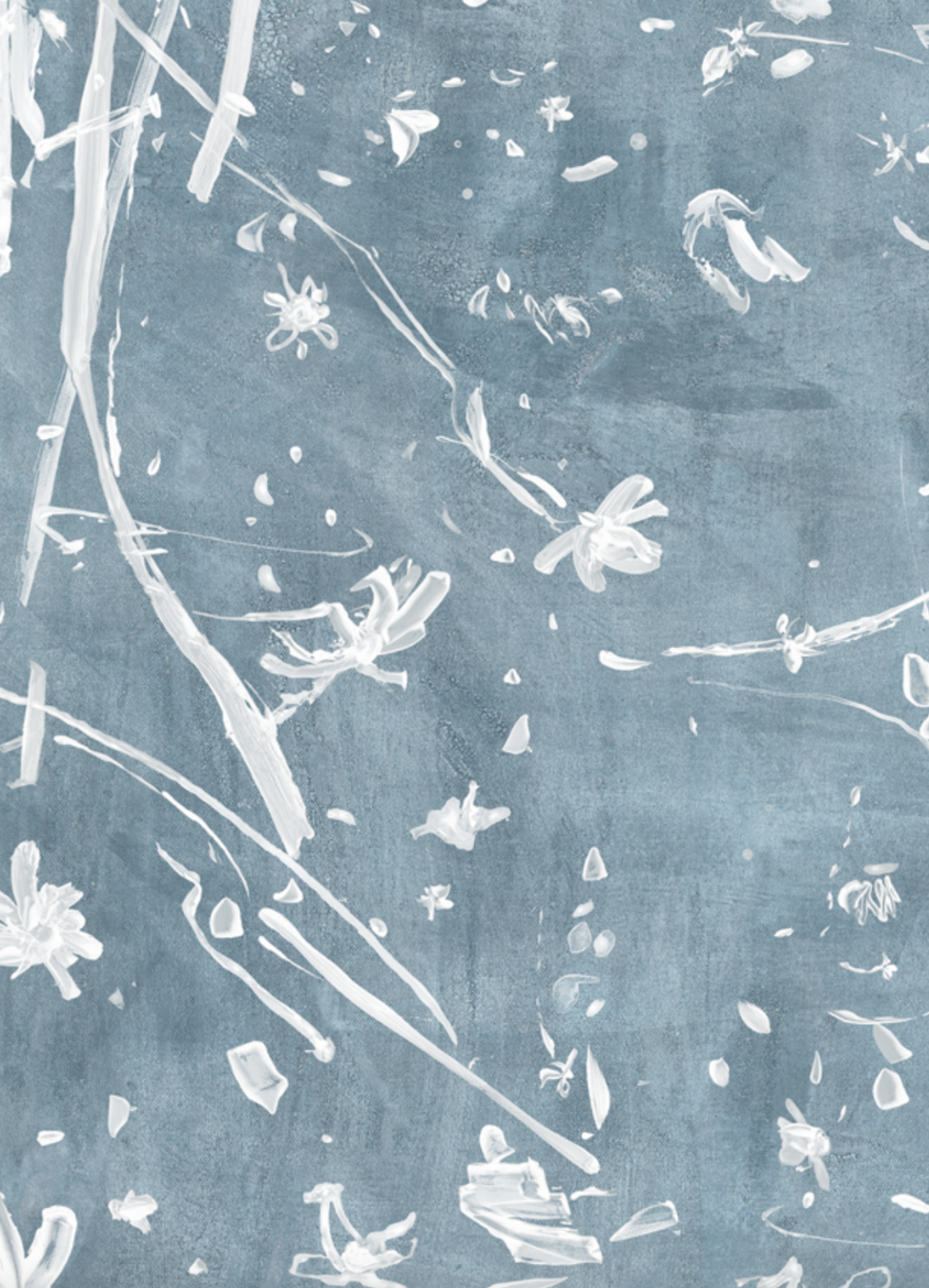 Loose gestural markings in a floral motif on a textural, chalky ground in soft, cool blue tones.