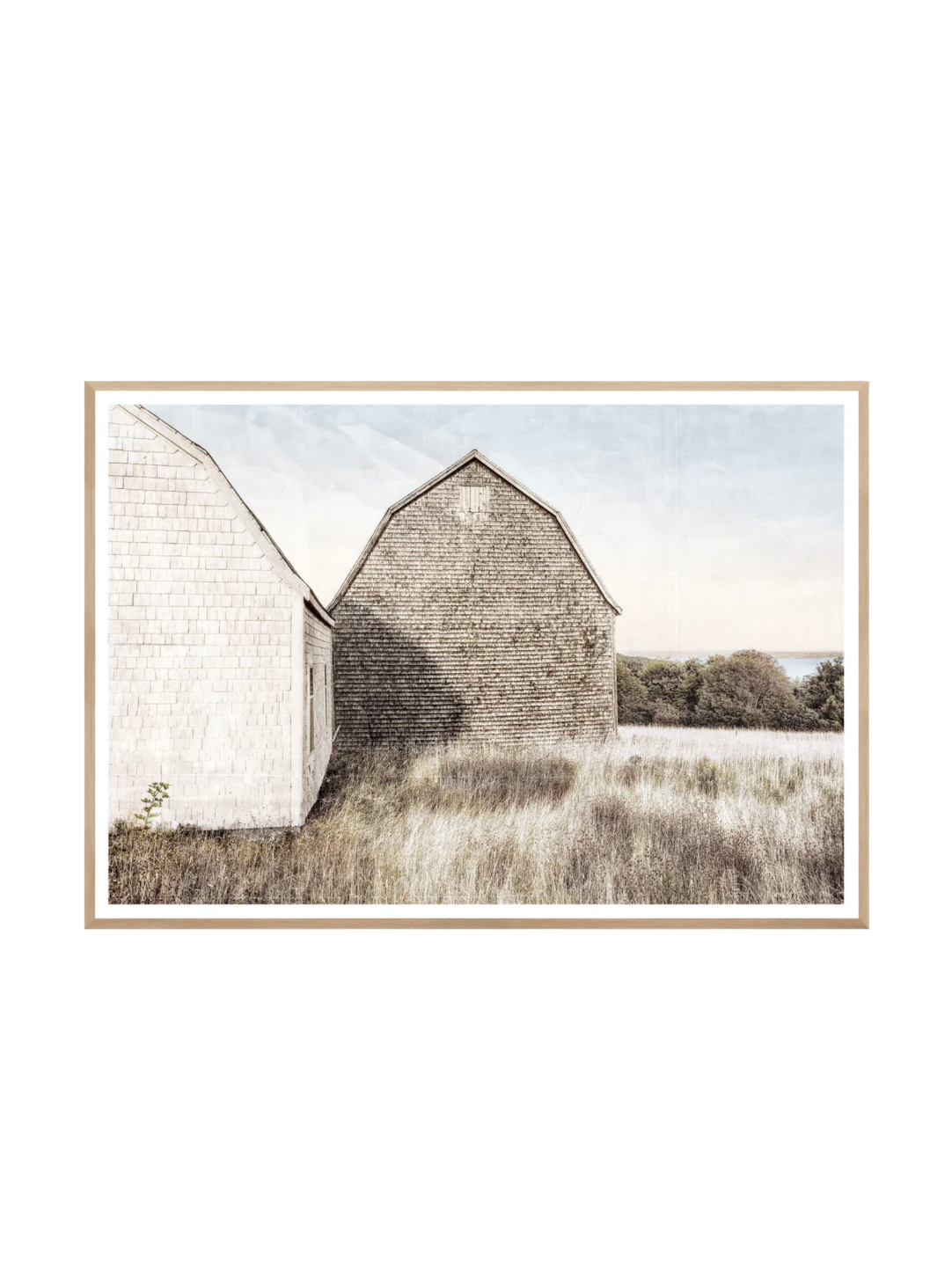 A tranquil depiction of weathered barns set against open fields and soft skies, capturing the charm of rural landscapes. A perfect piece for farmhouse or country-inspired decor.