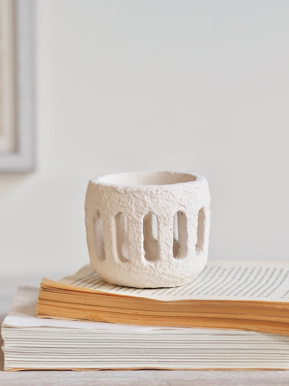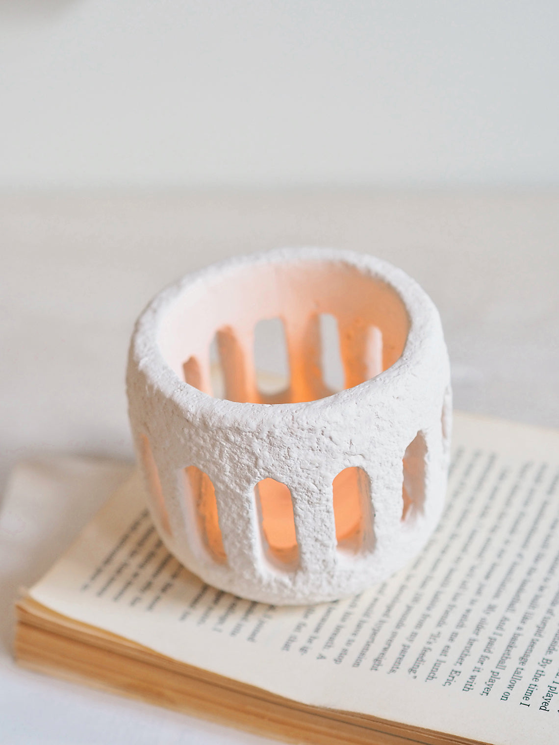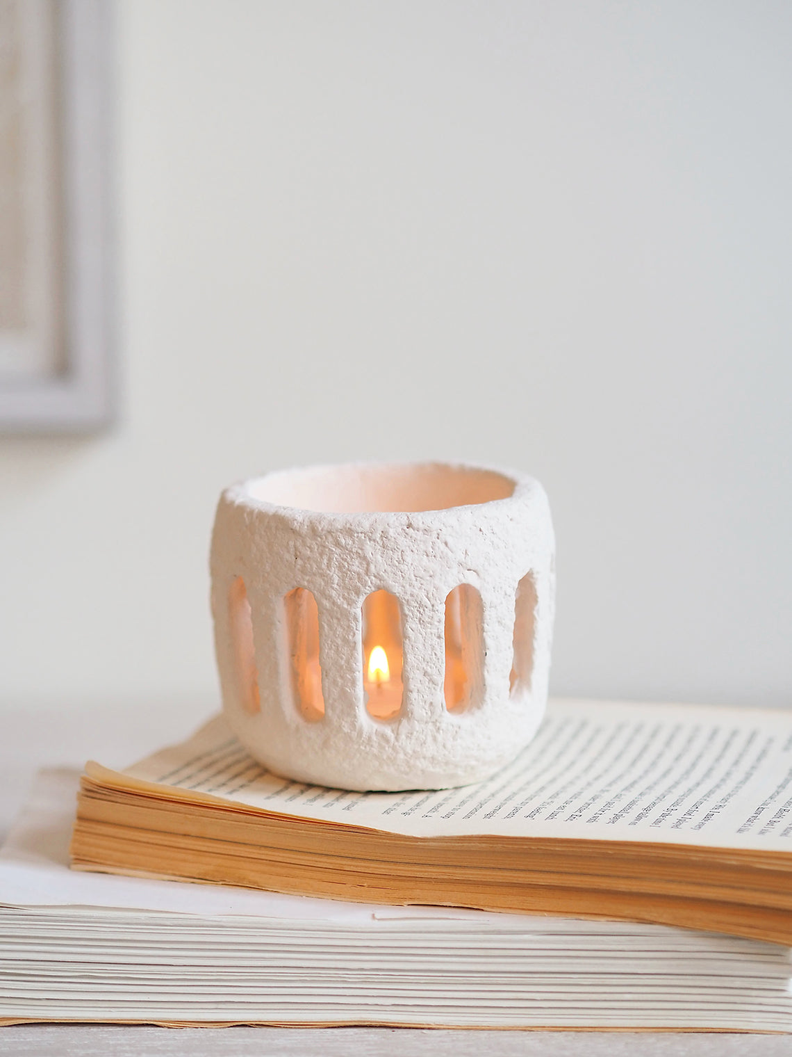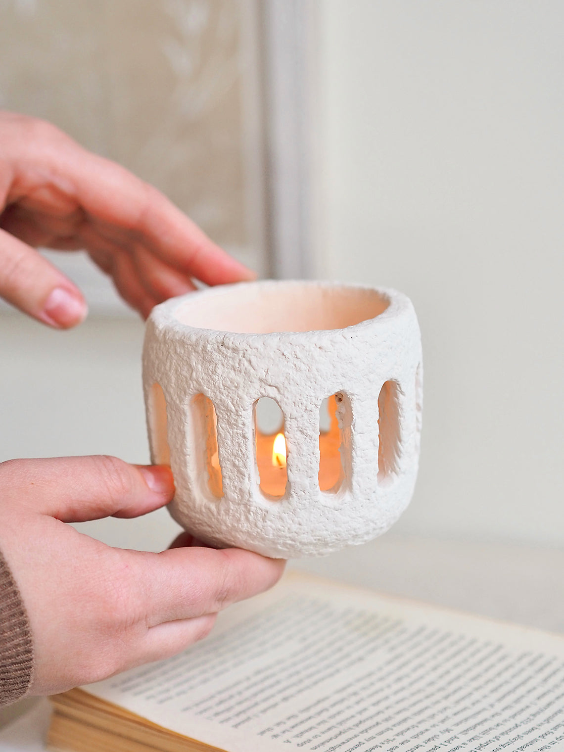 This hurricane is perfect for holding a votive or tea light. The cutout windows cast a warm, flickering glow, which is enhanced by the raw, matte texture. The candleholder adds a serene and natural touch to any space and combines beauty with practicality.