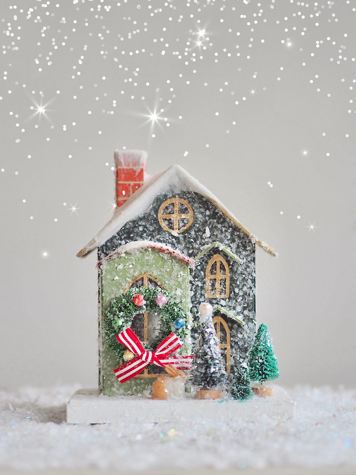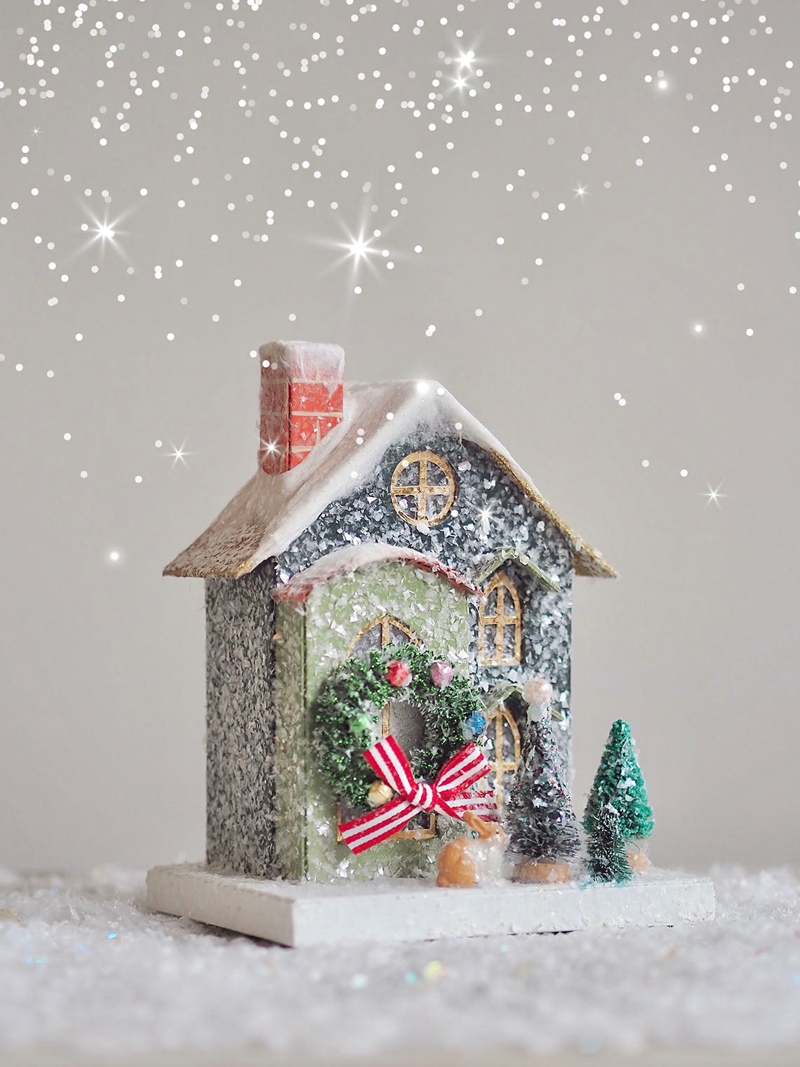 As these beautiful holiday houses are handmade, small pieces such as bottle brush trees or animal figures may need re-adjusting or glueing down after shipping.