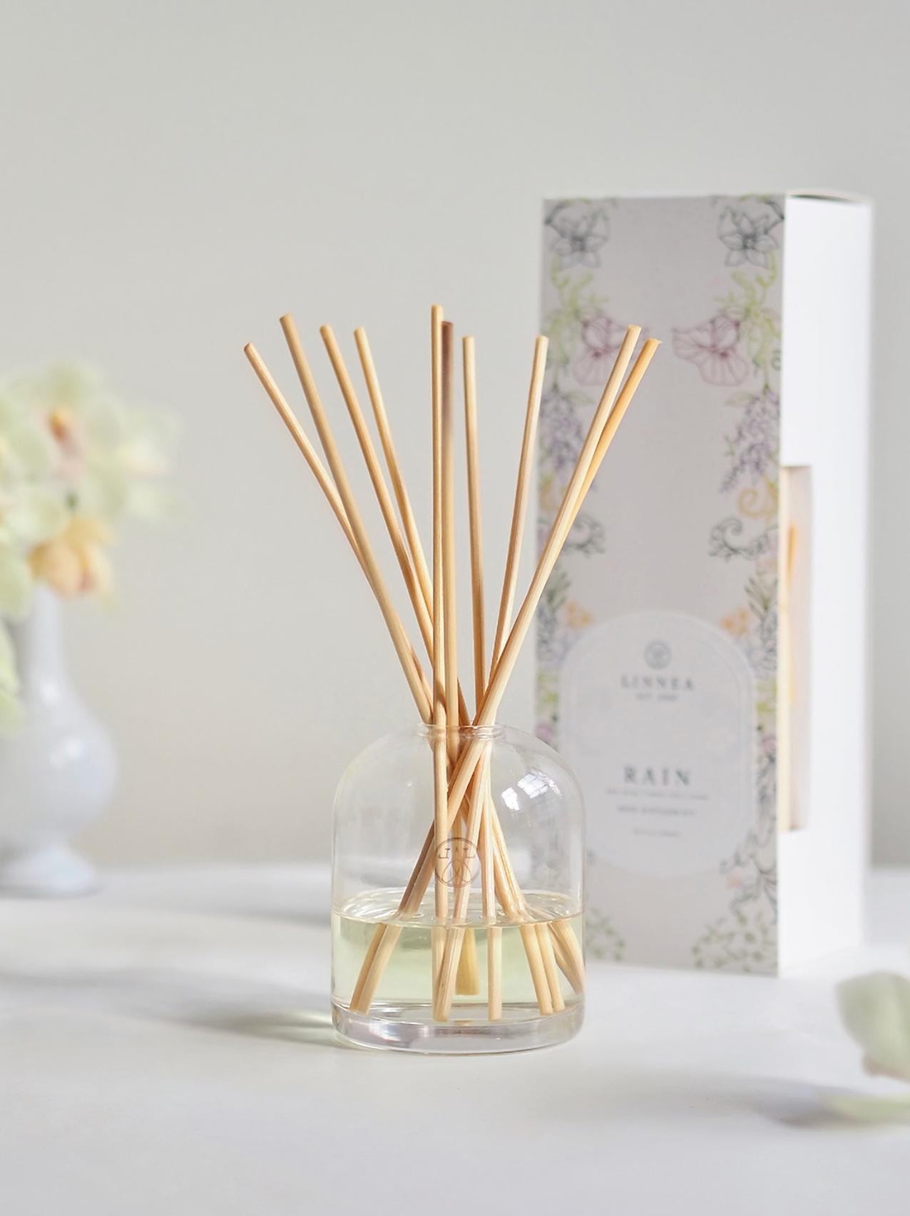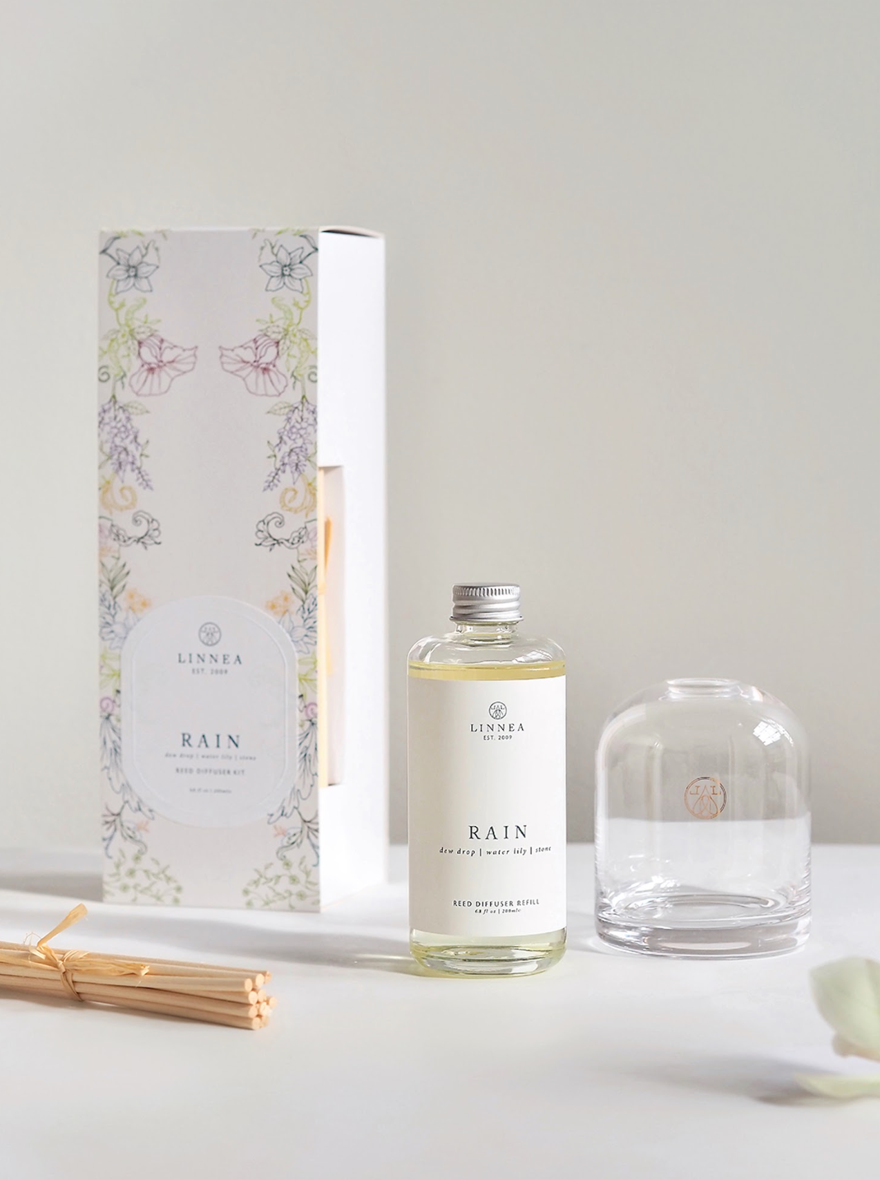 Rain is an elevated, airy escape for your space. This fresh, tranquil blend evokes gentle rainfall, glistening flora, and morning mist. Dew drop, water lily, and stone create a serene, cleansing ambiance.