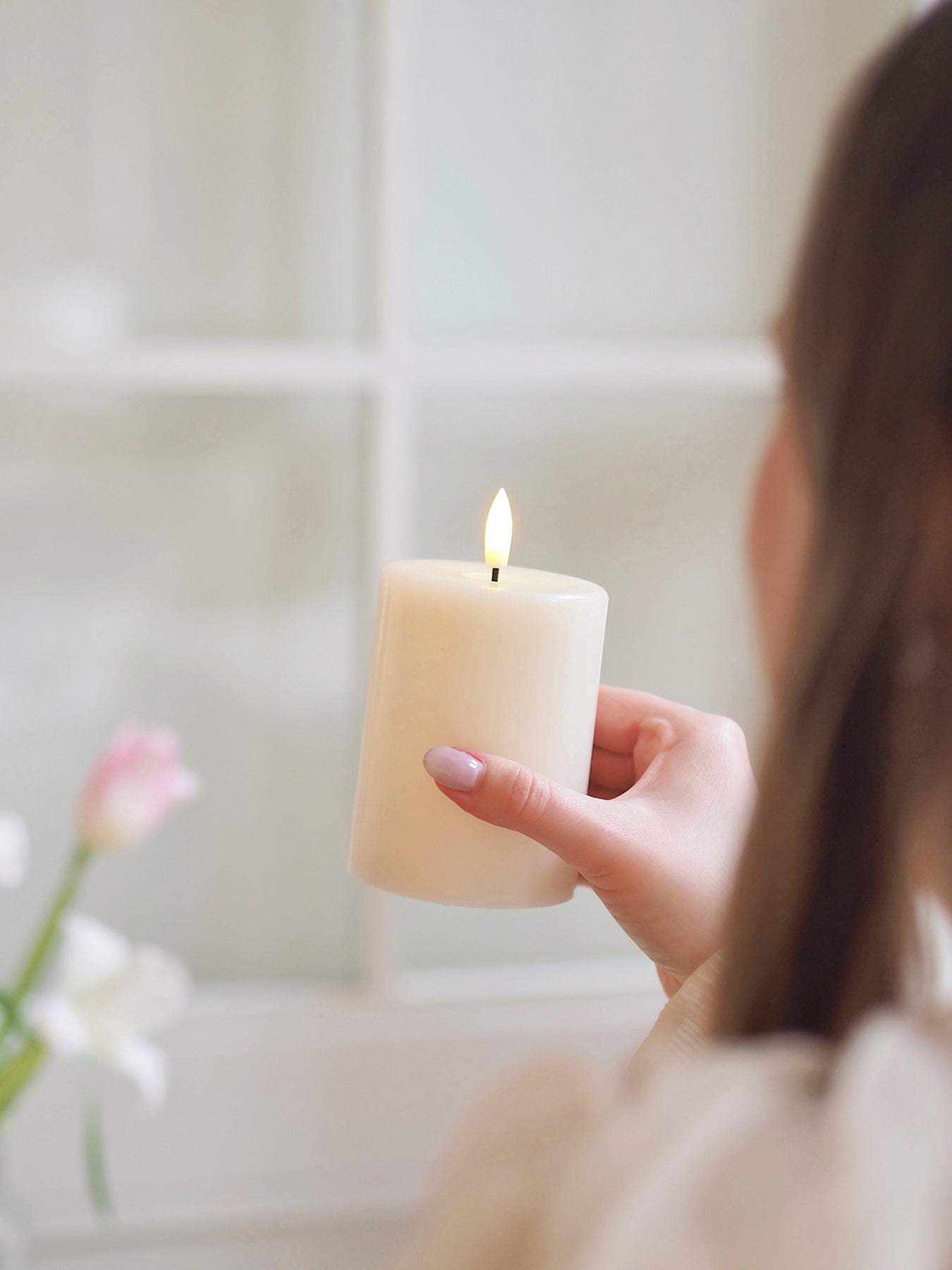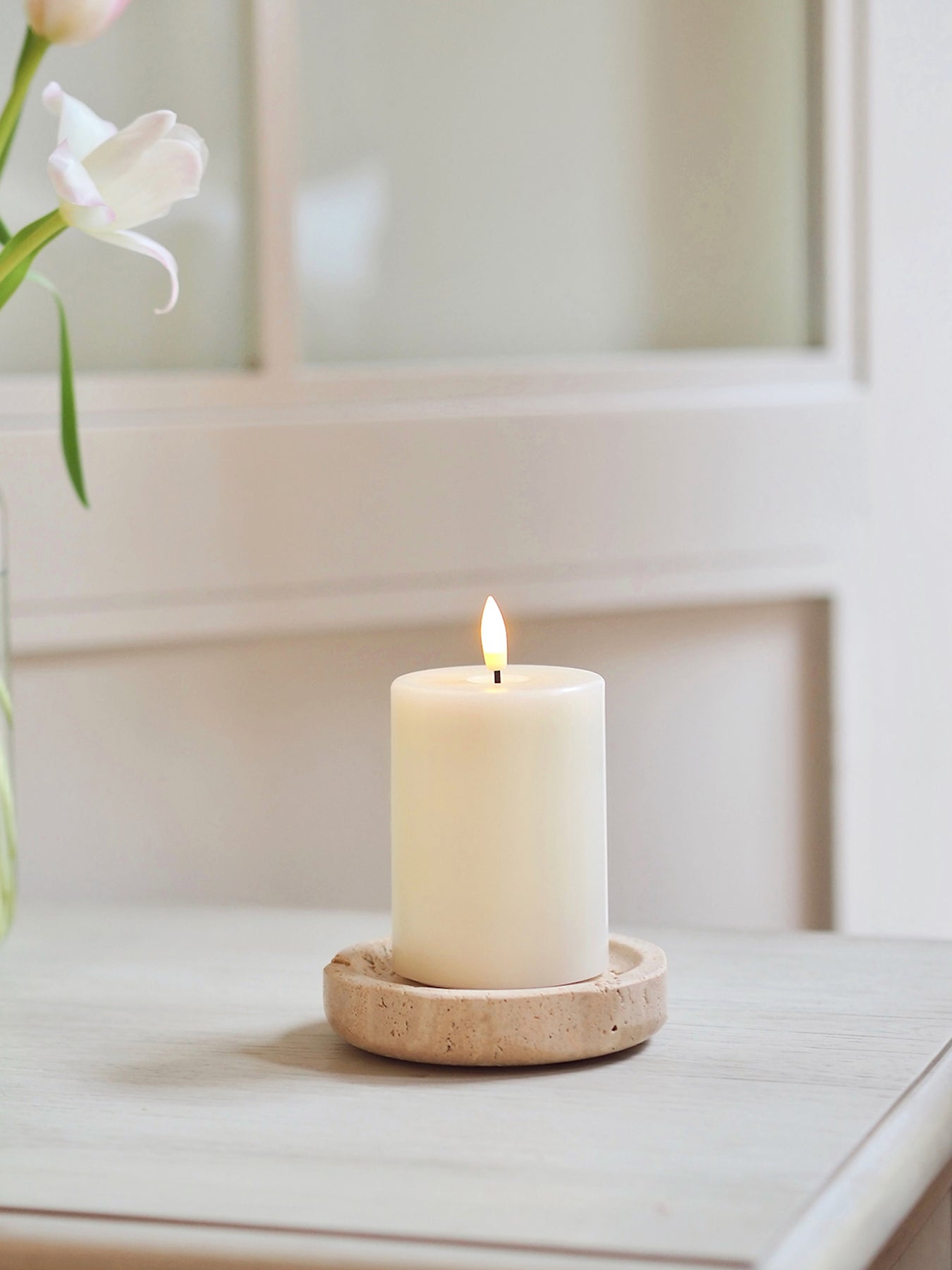 Enjoy the warm glow of candlelight without any fear of fire or mess with this elegant sand LED Pillar Candle. Designed in Sweden, this all-wax candle features a realistic, pulsating 3D LED flame with a runtime of over 150 hours. Features an 8-hour timer.