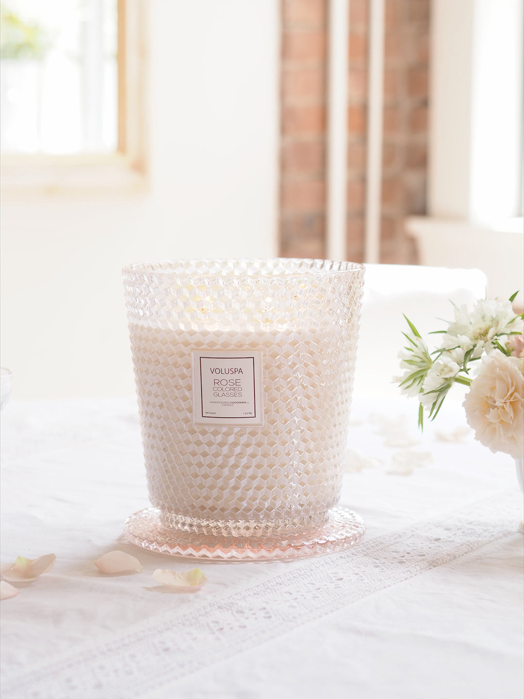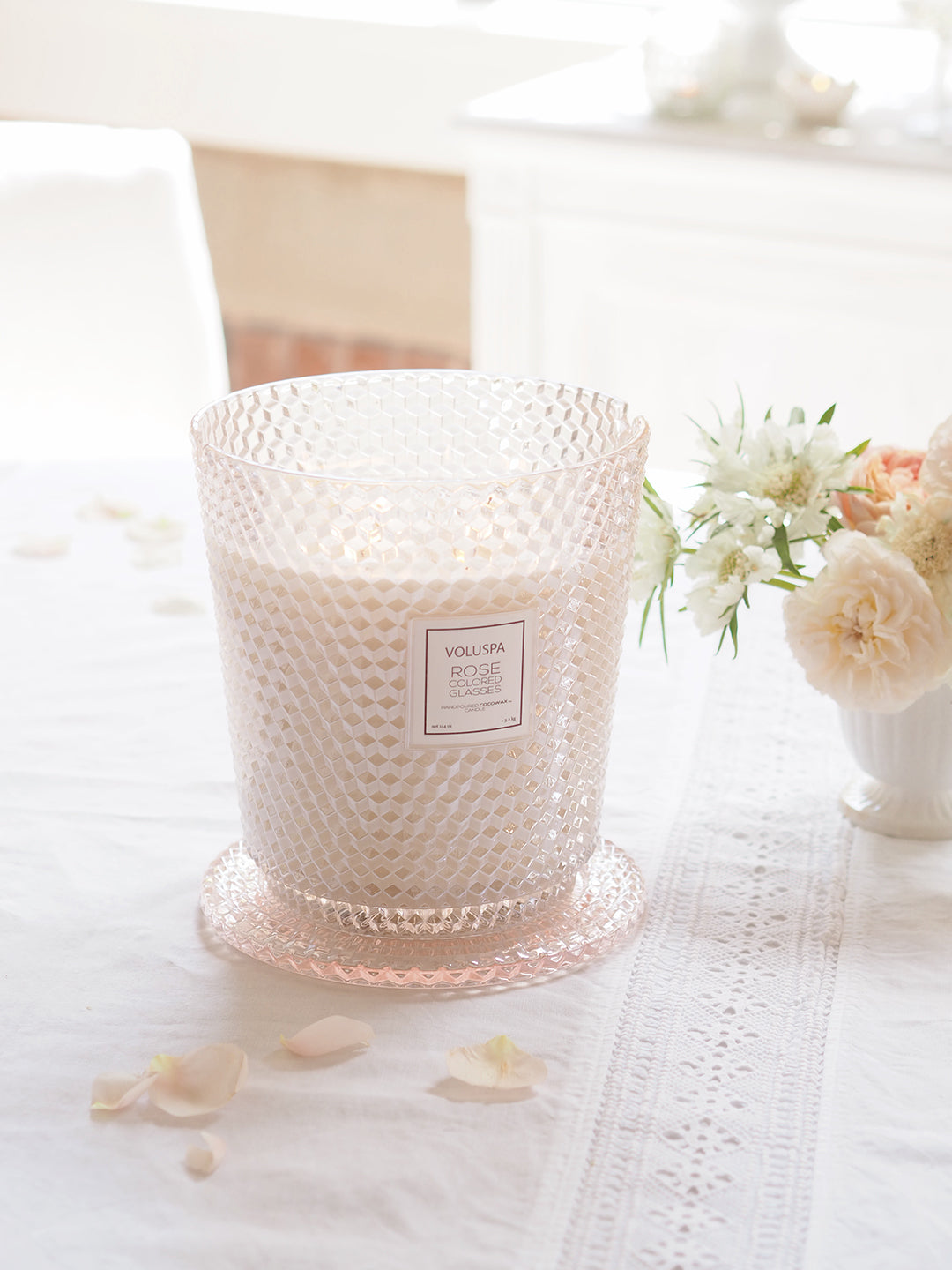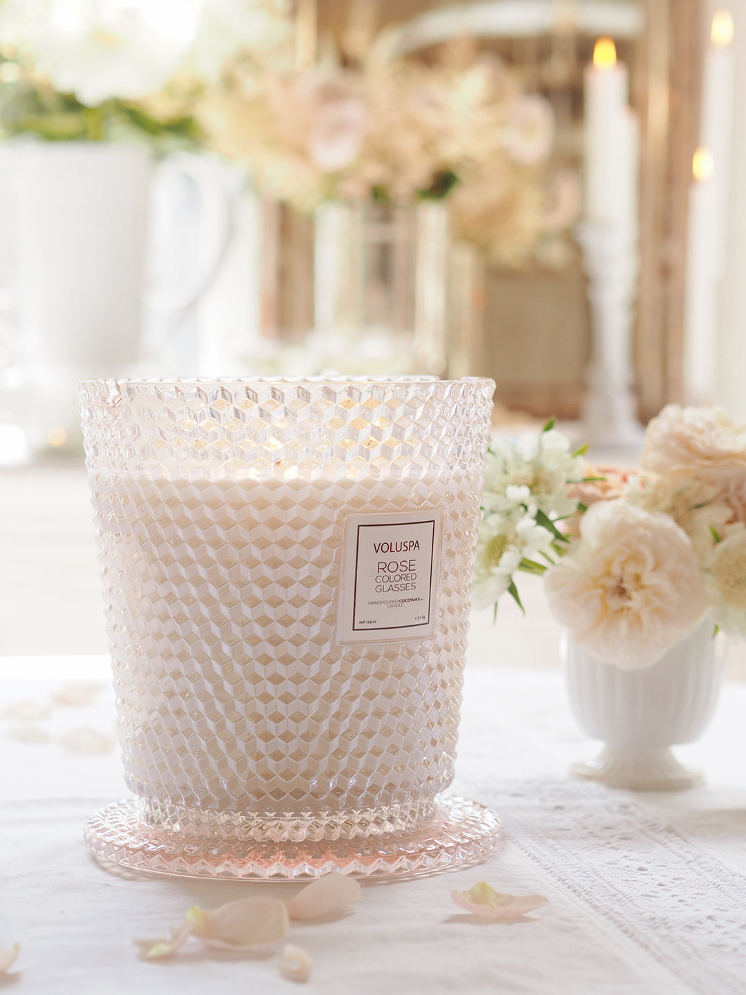 A 5-wick gorgeous glass candle embossed with a classic 3D geometric cube pattern, colored to match the rose that served as fragrance and packaging inspiration.