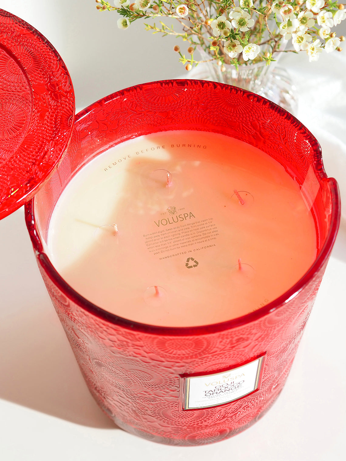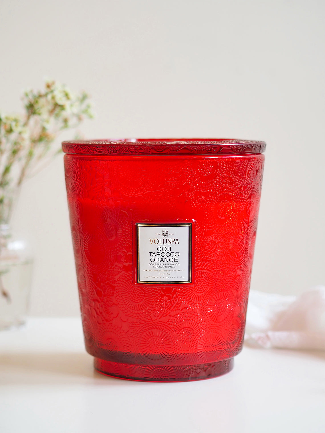 A jewel within the Japonica Collection. Our largest format in an embossed glass design sends fragrance wafting from each of its five wicks. Use the lid to protect from dust while not in use, or as a decorative tray while burning. Repurpose the container long after the candle is gone for keepsakes or decor.