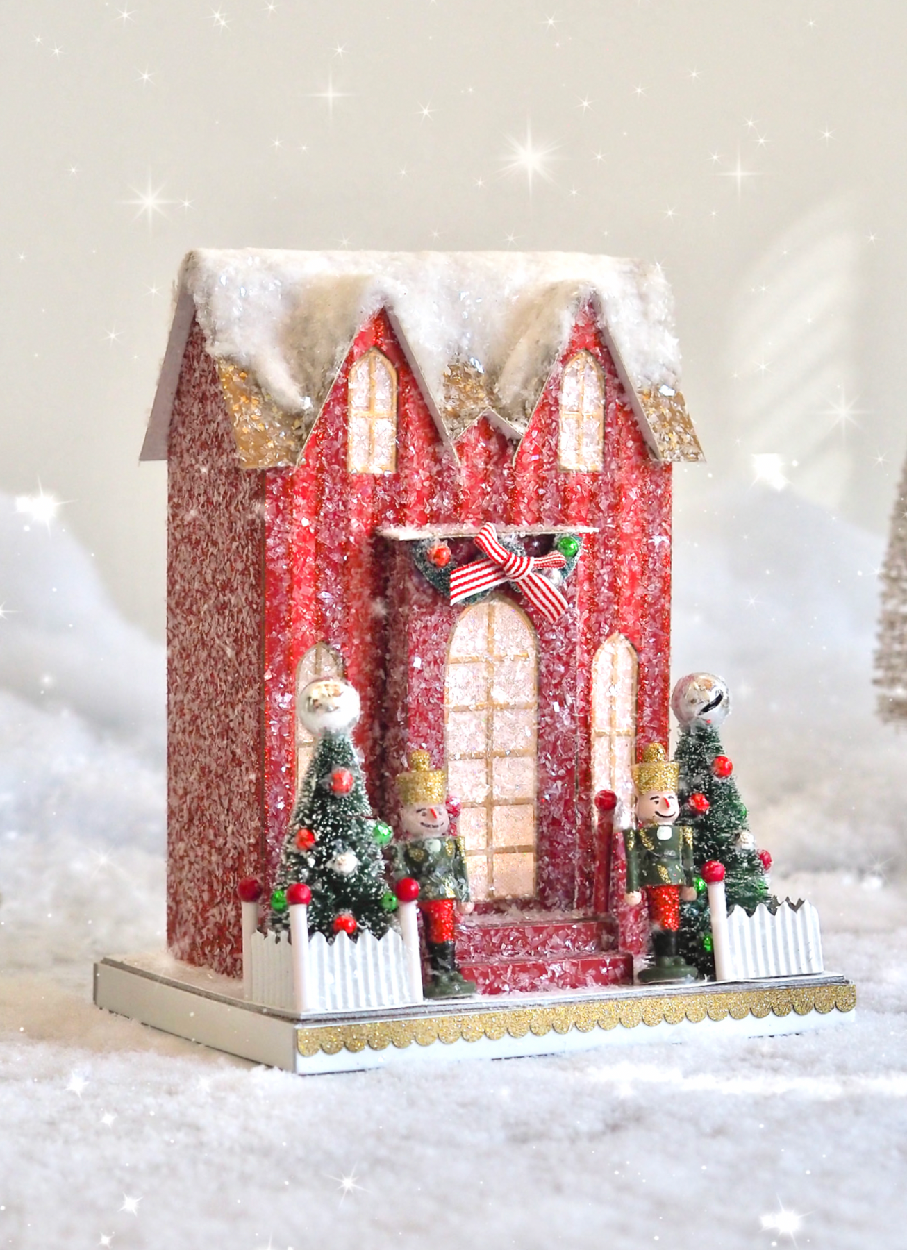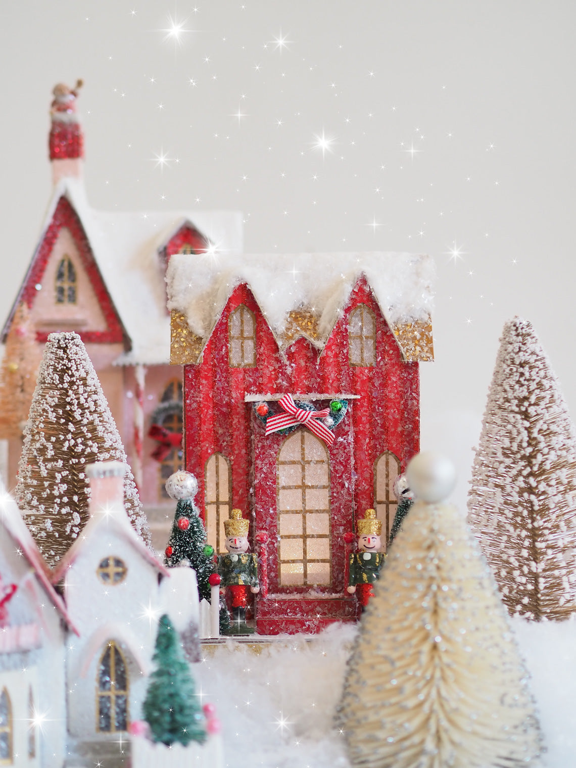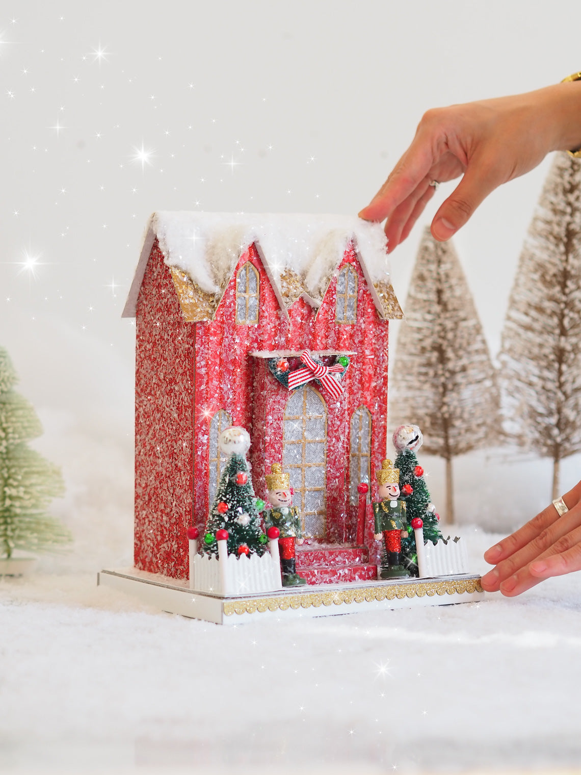Add a sweet coquette-inspired touch to your Christmas decor with these charming lighted glitter houses! One features light green with dark green stripes, and the other light red with rich red stripes. Each house is topped with a gold glittered roof dusted in snow, a dainty bow above the door, and flanked by a pair of nutcrackers and bottlebrush trees.