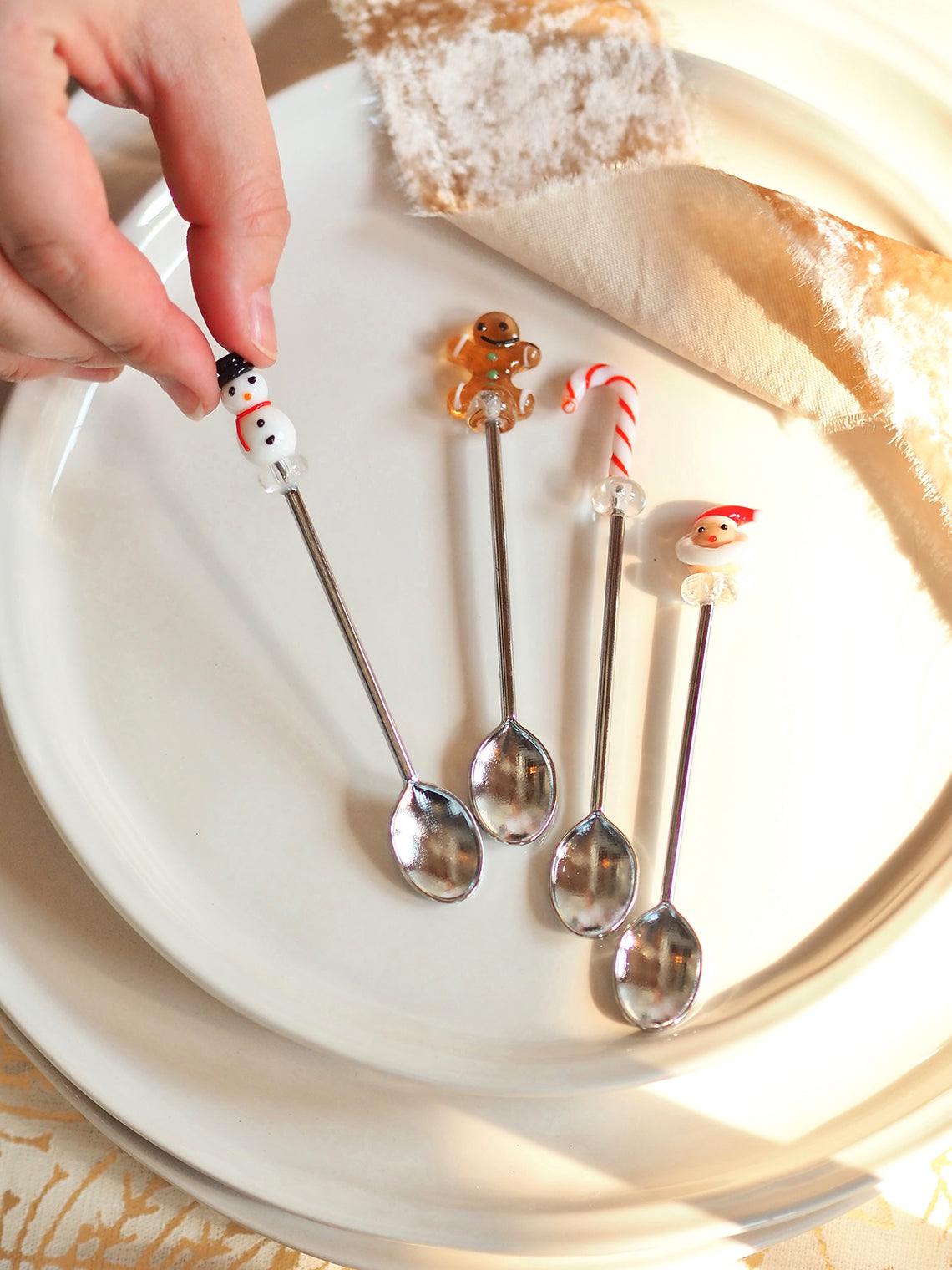 Add festive flair to your holiday entertaining with this set of 4 Holiday Icon Spoons. Crafted out of metal, these small spoons are accented with glass icons (Santa, gingerbread man, snowman, candy cane) to make serving coffee or dessert more seasonal and stylish.