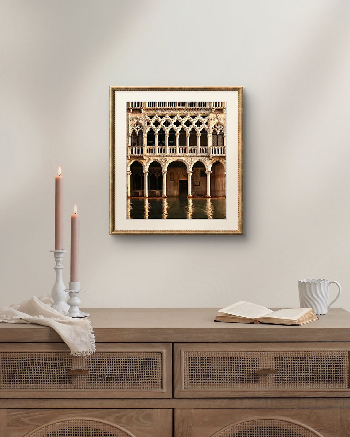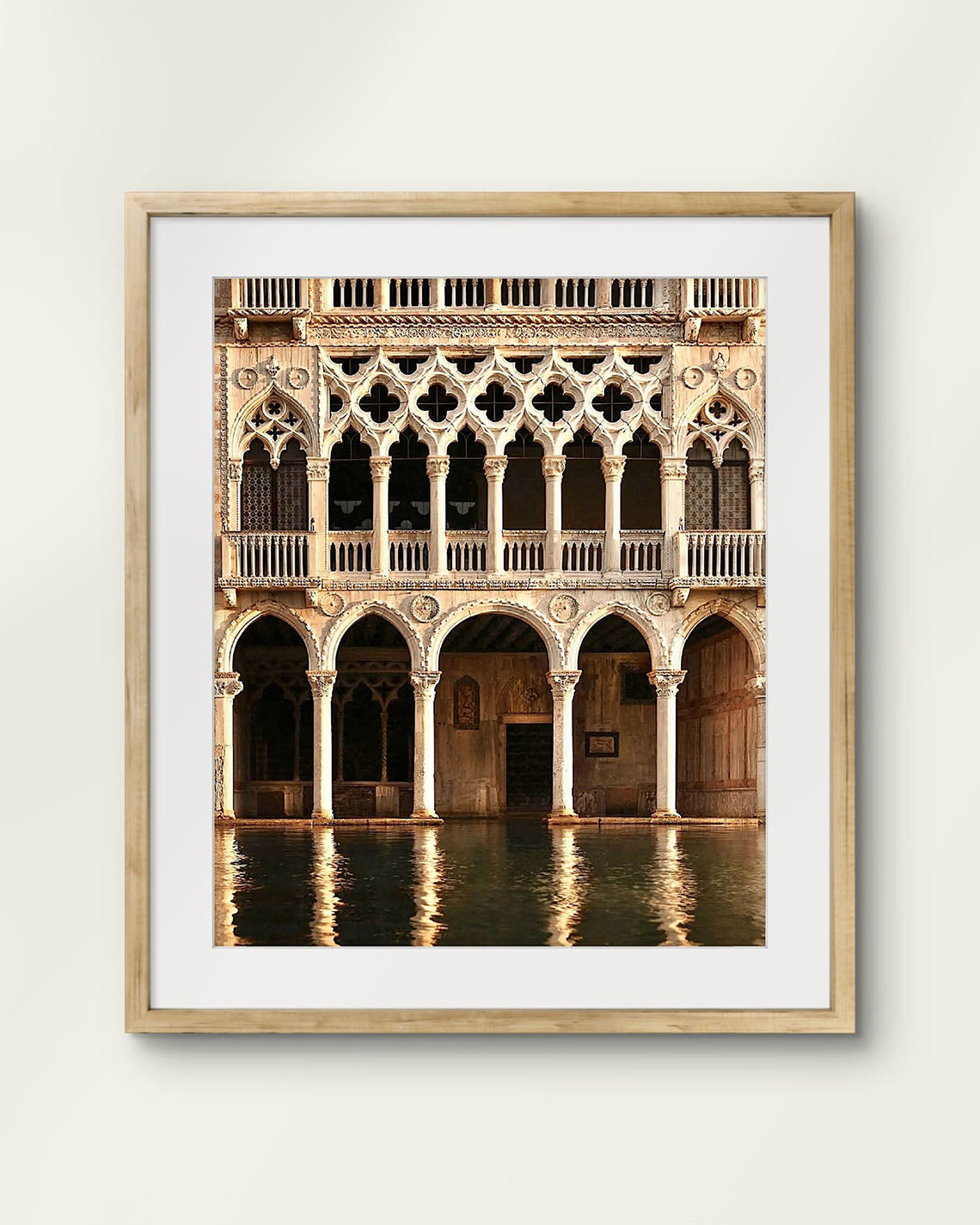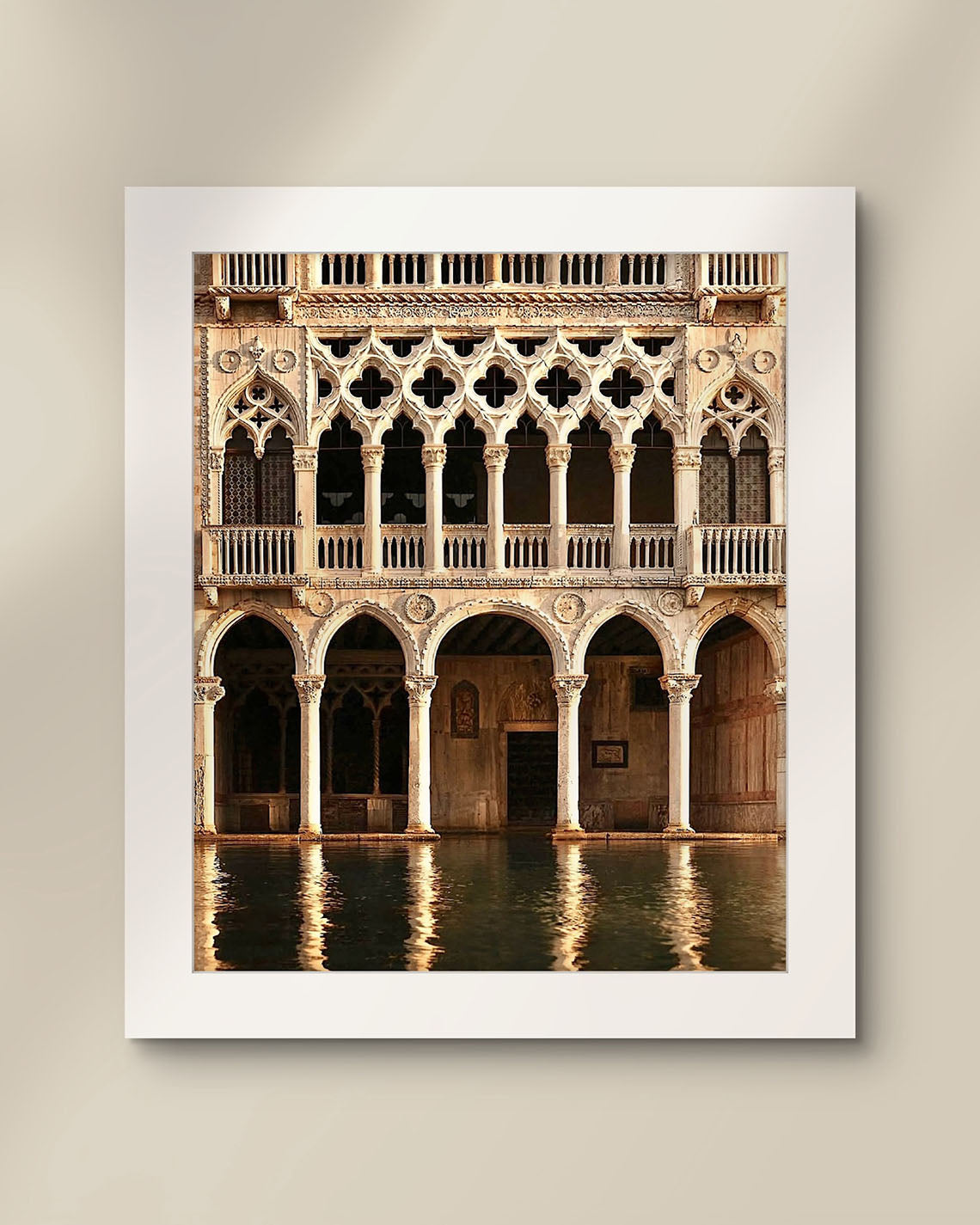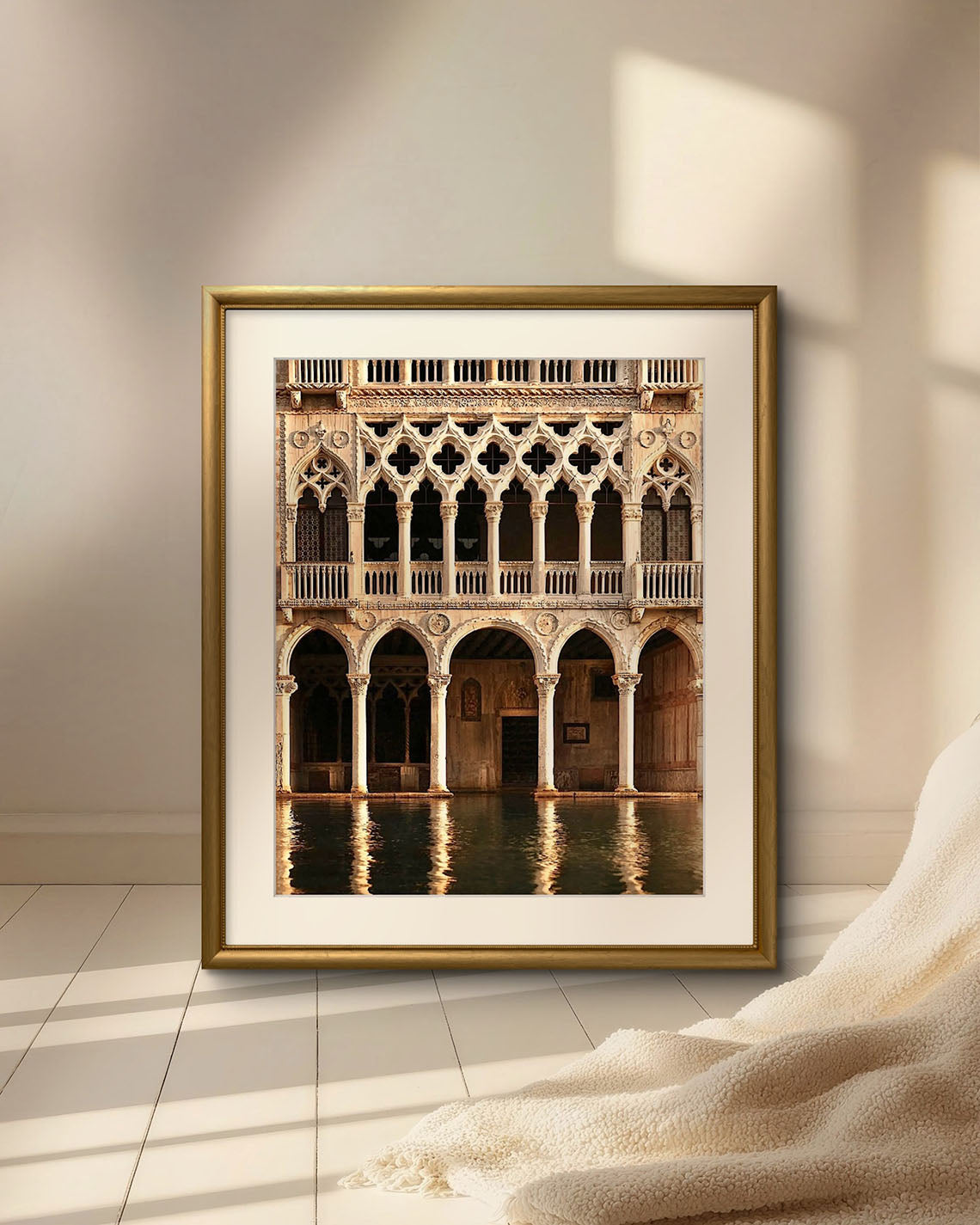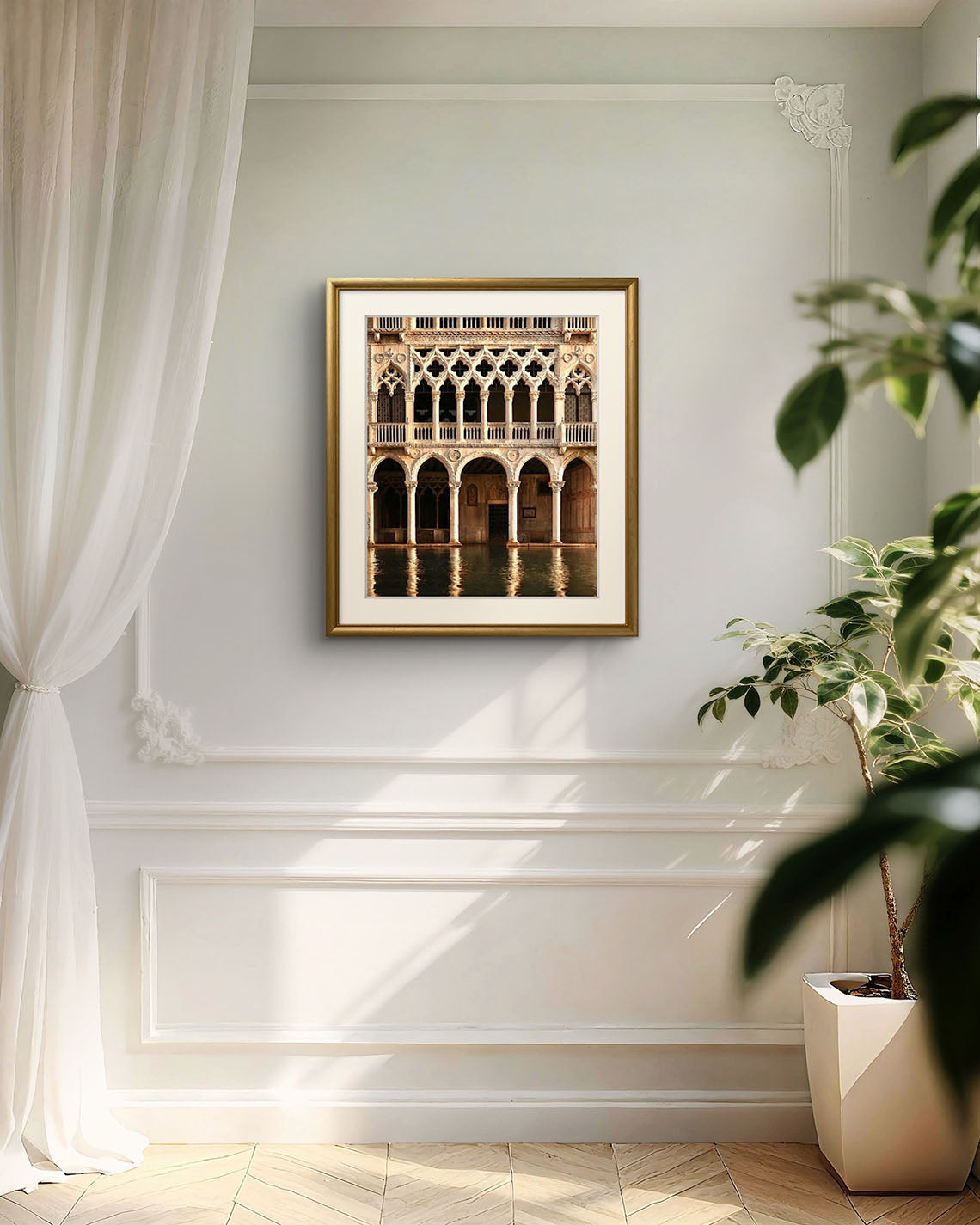 The gilded elegance of the Galleria d’Oro shimmers softly along the Venetian waterfront, its ornate architecture mirrored in the gently moving water below. Stone, gold, and centuries of history dissolve into reflection, blurring the line between what is built and what is dreamed. Venice reveals itself here not as a postcard, but as a living, breathing work of art.
