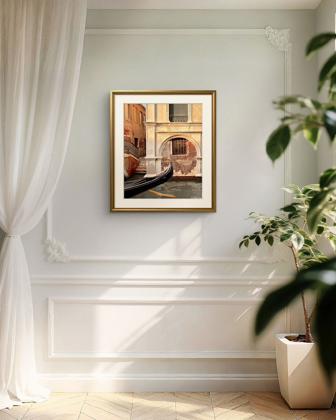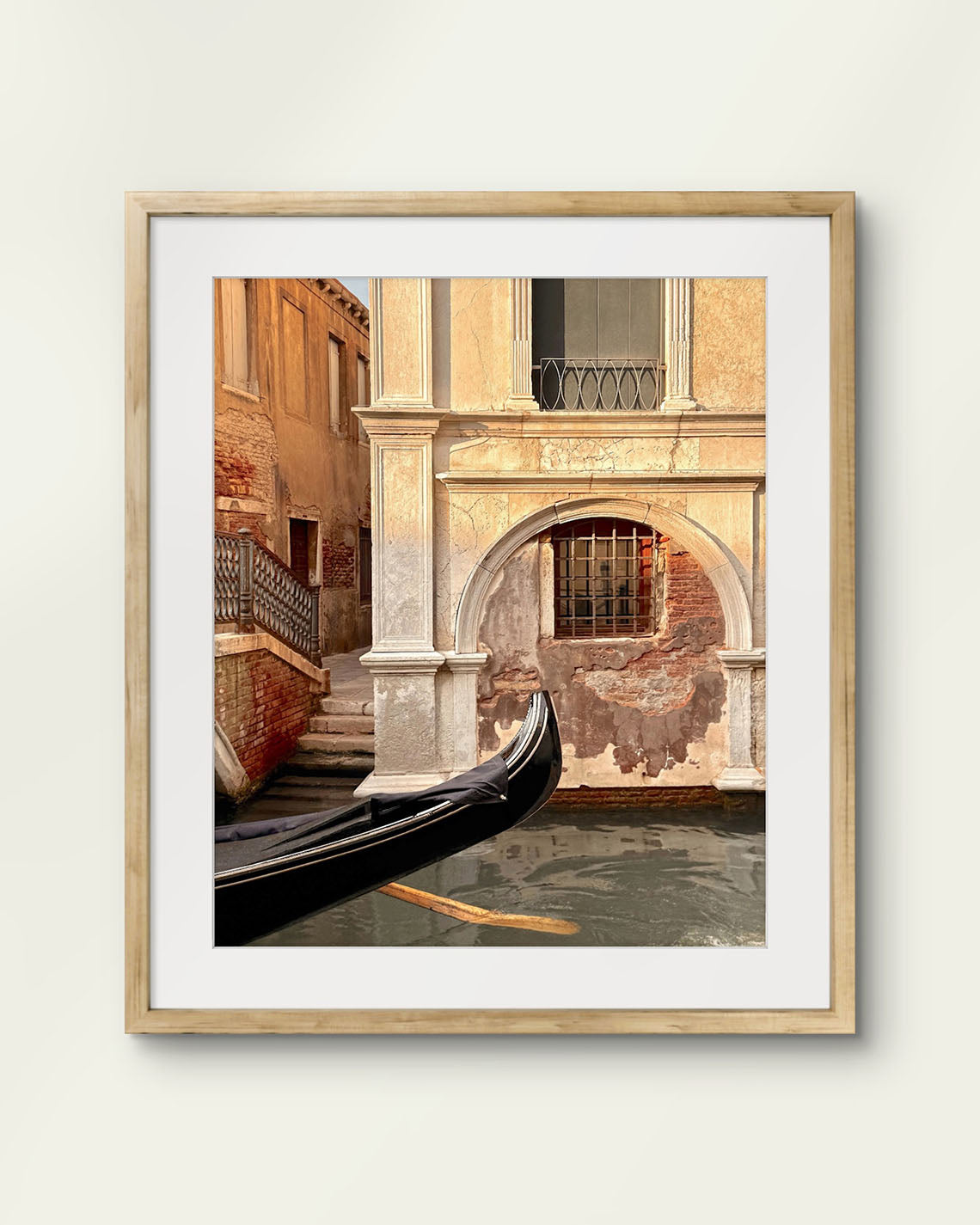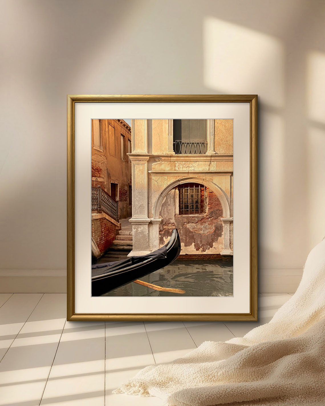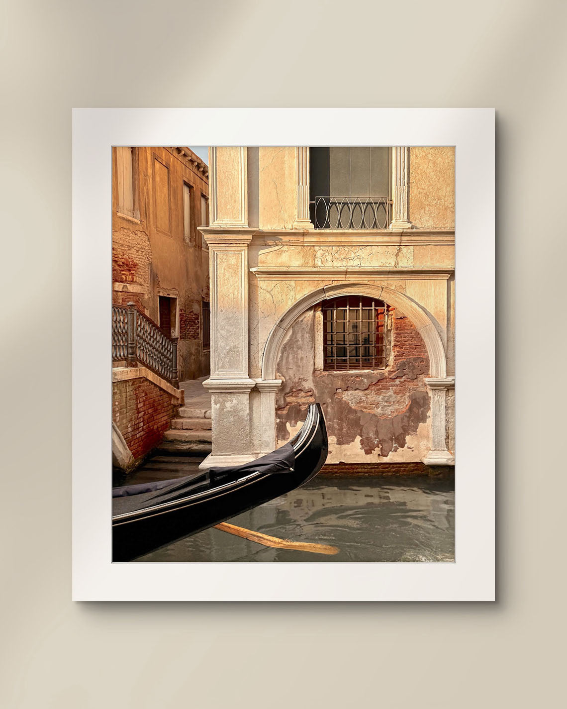 A gondola drifts gently along a Venetian canal, its oars slicing through the water and sending ripples across the surface. The boat enters the frame, a quiet reminder of movement and life amidst the still grandeur of the surrounding architecture. The sun leans low, casting warm, golden light across weathered walls, bringing every brick and stone to glowing life.