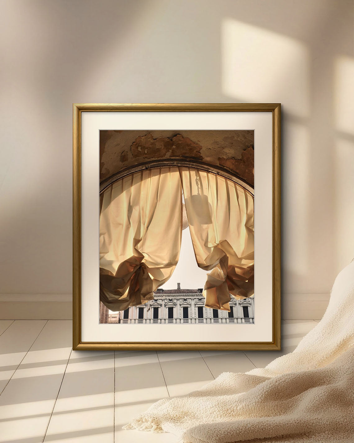 Soft yellow curtains hang within the arches of St. Mark’s Square, gently parted as if inviting you to look beyond to step forward and discover Venice waiting on the other side. Framed by timeworn stone, the scene unfolds in layers: aged walls above, classical architecture below, and at the centre, fabric caught in a quiet human gesture.