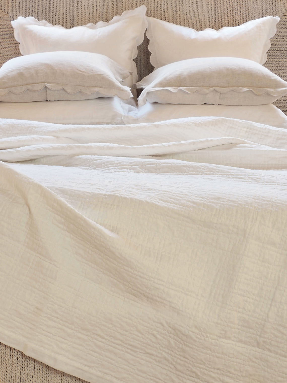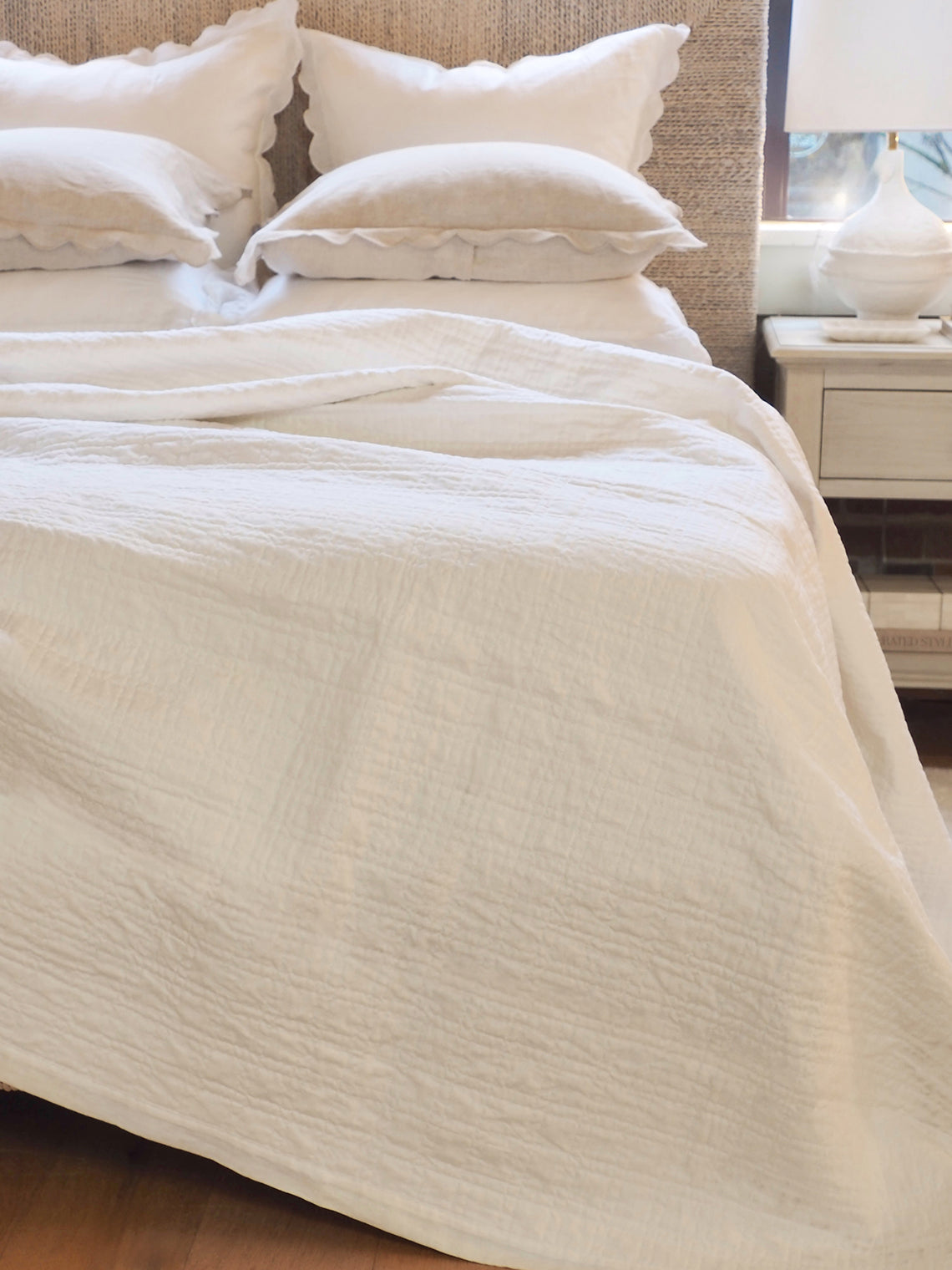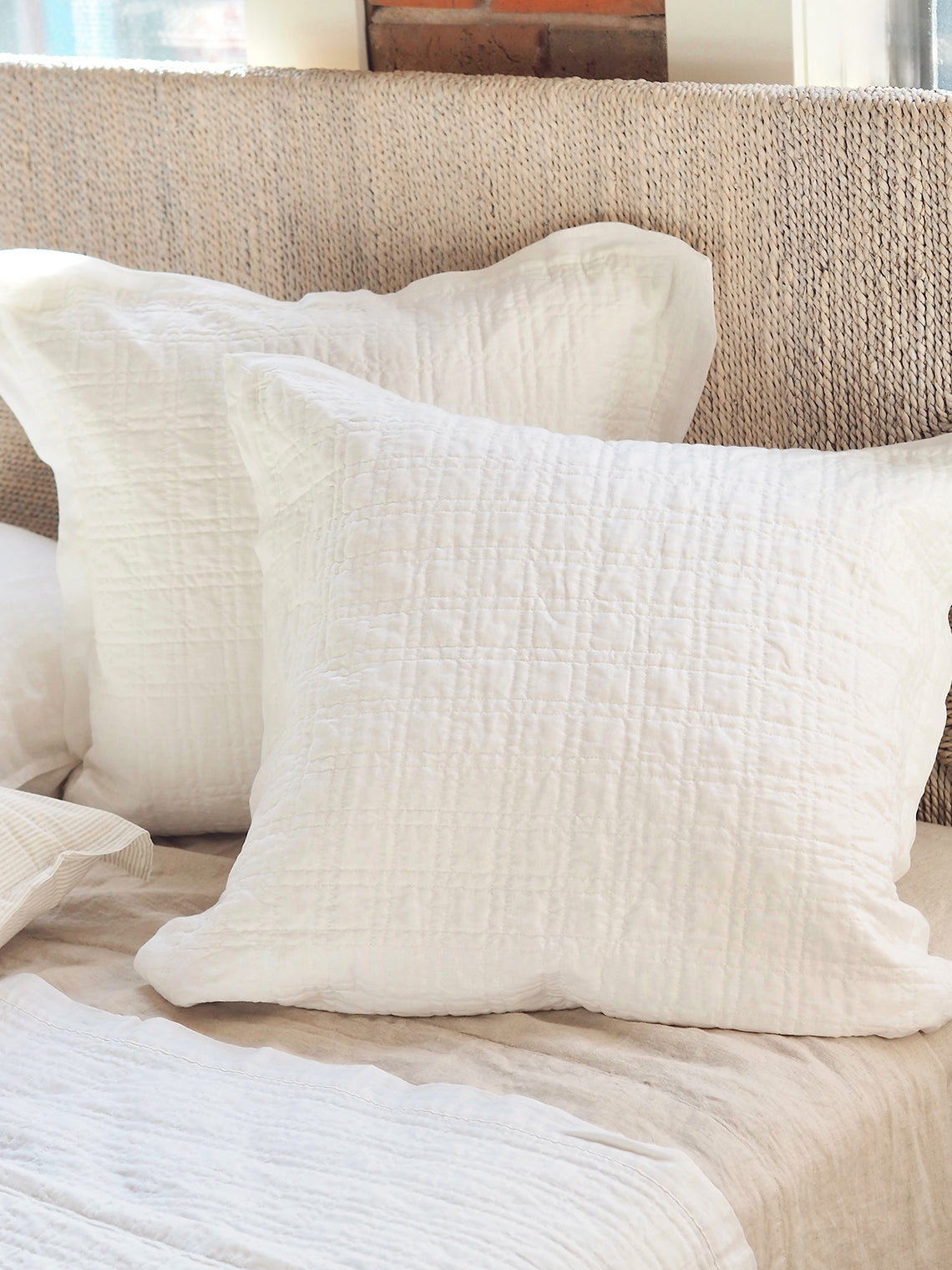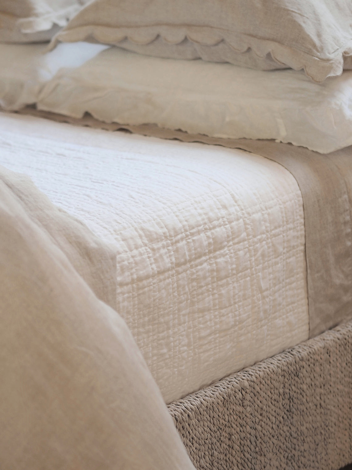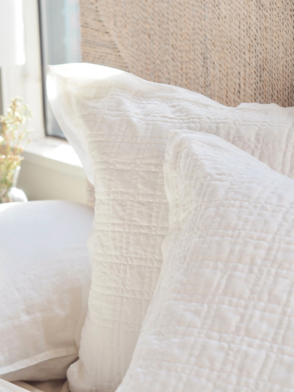 The quilted square pattern on this linen and cotton coverlet offers a refined, textured design that gives your bedding subtle depth and dimension. Its uniform stitches create a clean, structured aesthetic, while the softness of the quilting ensures endless comfortable nights. There’s nothing quite like this quilted square pattern coverlet collection.