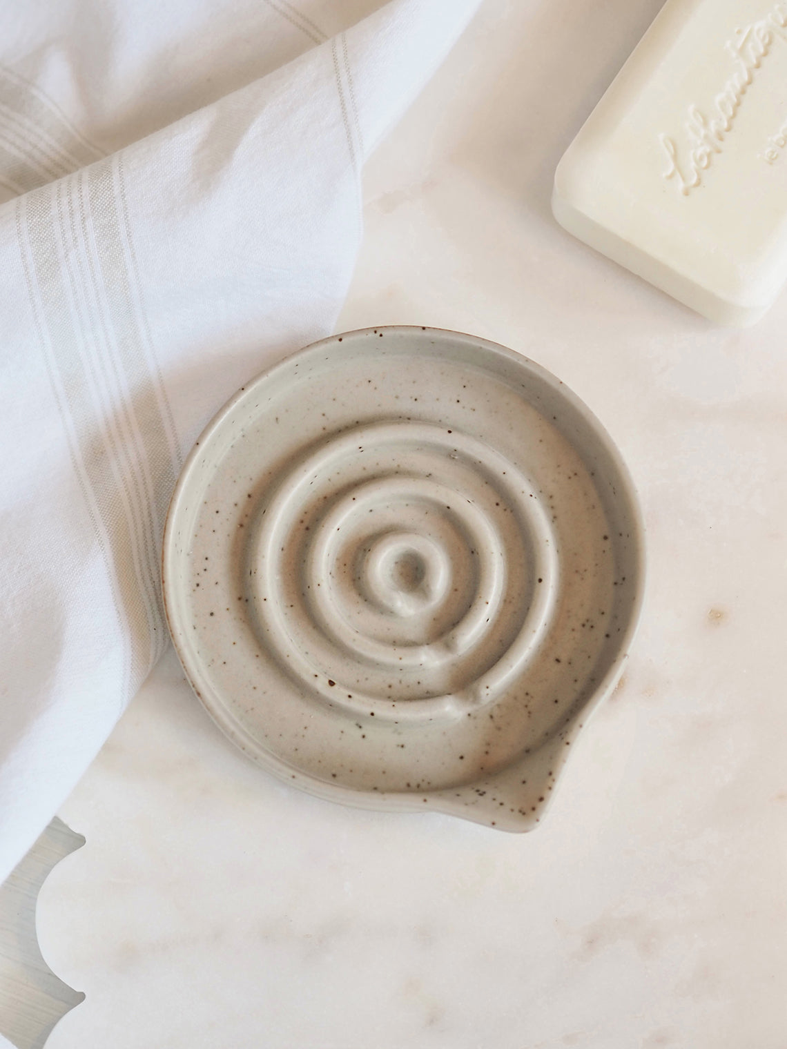 With raised rings at the base to prevent soap from sitting in water and an angled spout for easy pour, this stoneware soap dish is the perfect essential for any kitchen or bathroom.