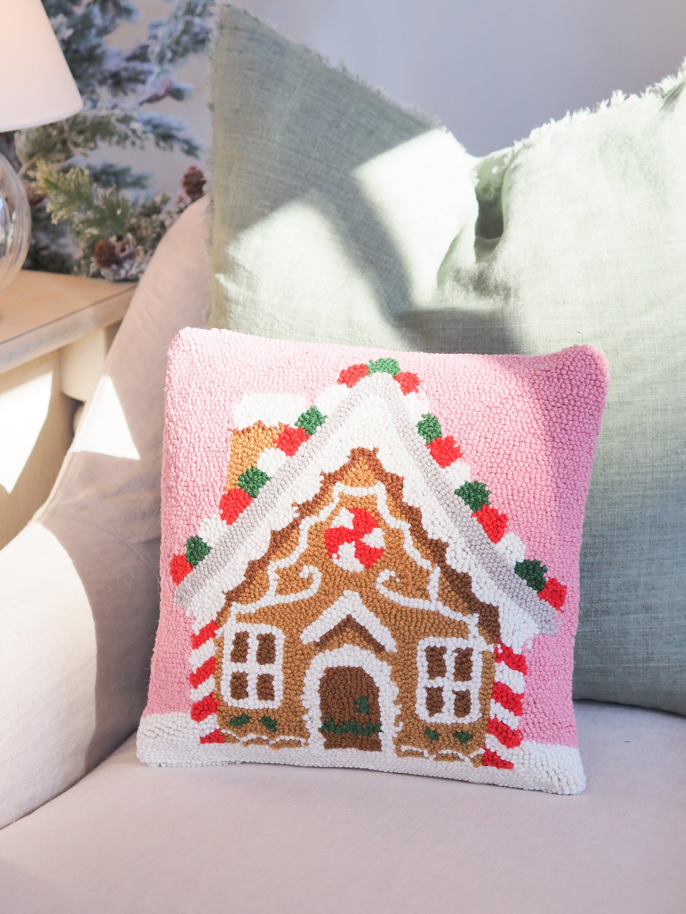 Bring festive charm to your space with this playful Gingerbread House with Candy Cane Hook Pillow. Hand-hooked with vibrant colours, it’s a cozy accent that instantly sets the Holiday vibes.