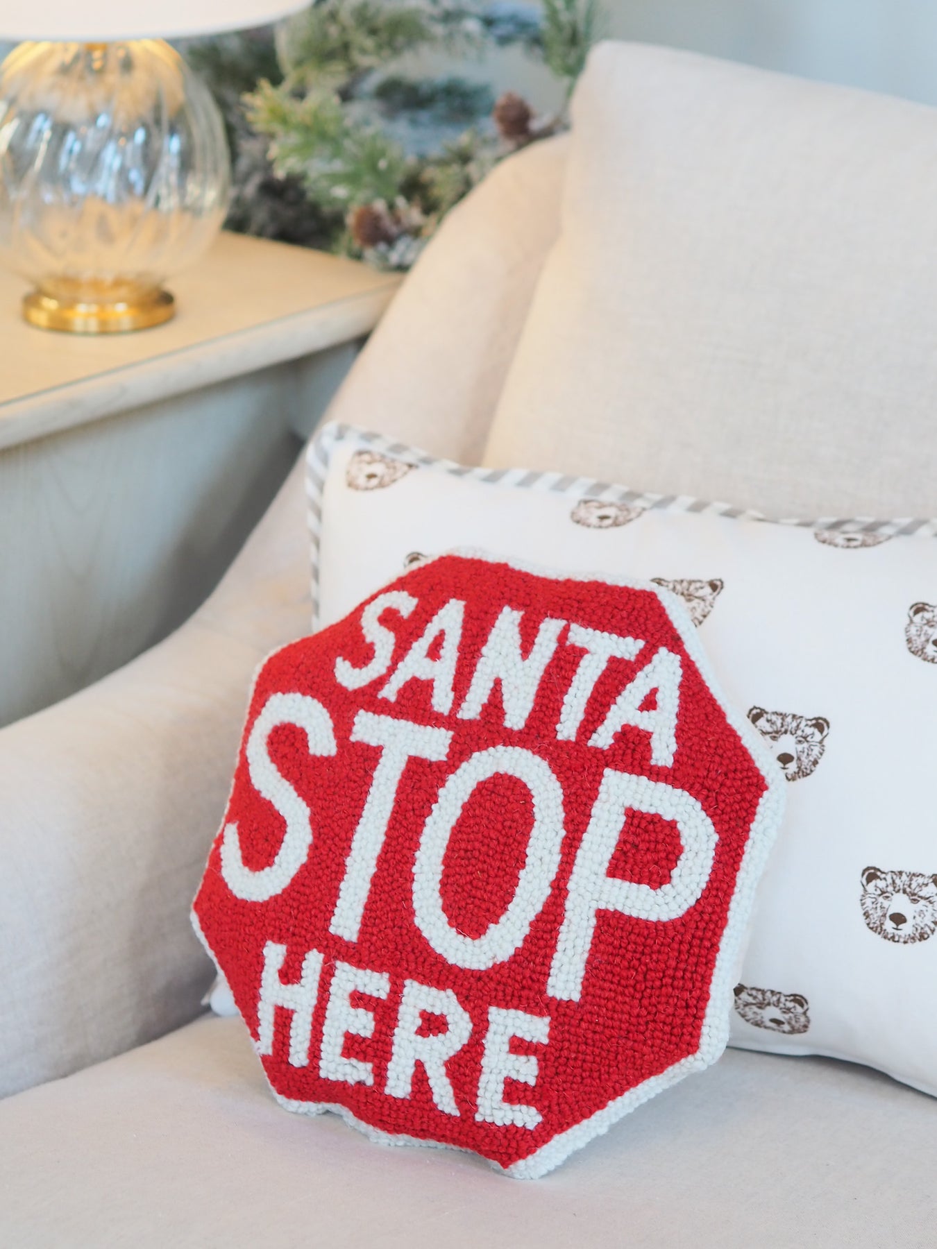 Bring festive charm to your space with this playful Santa Stop Sign Hook Pillow. Hand-hooked with vibrant colours, it’s a cozy accent that instantly sets the Holiday vibes.