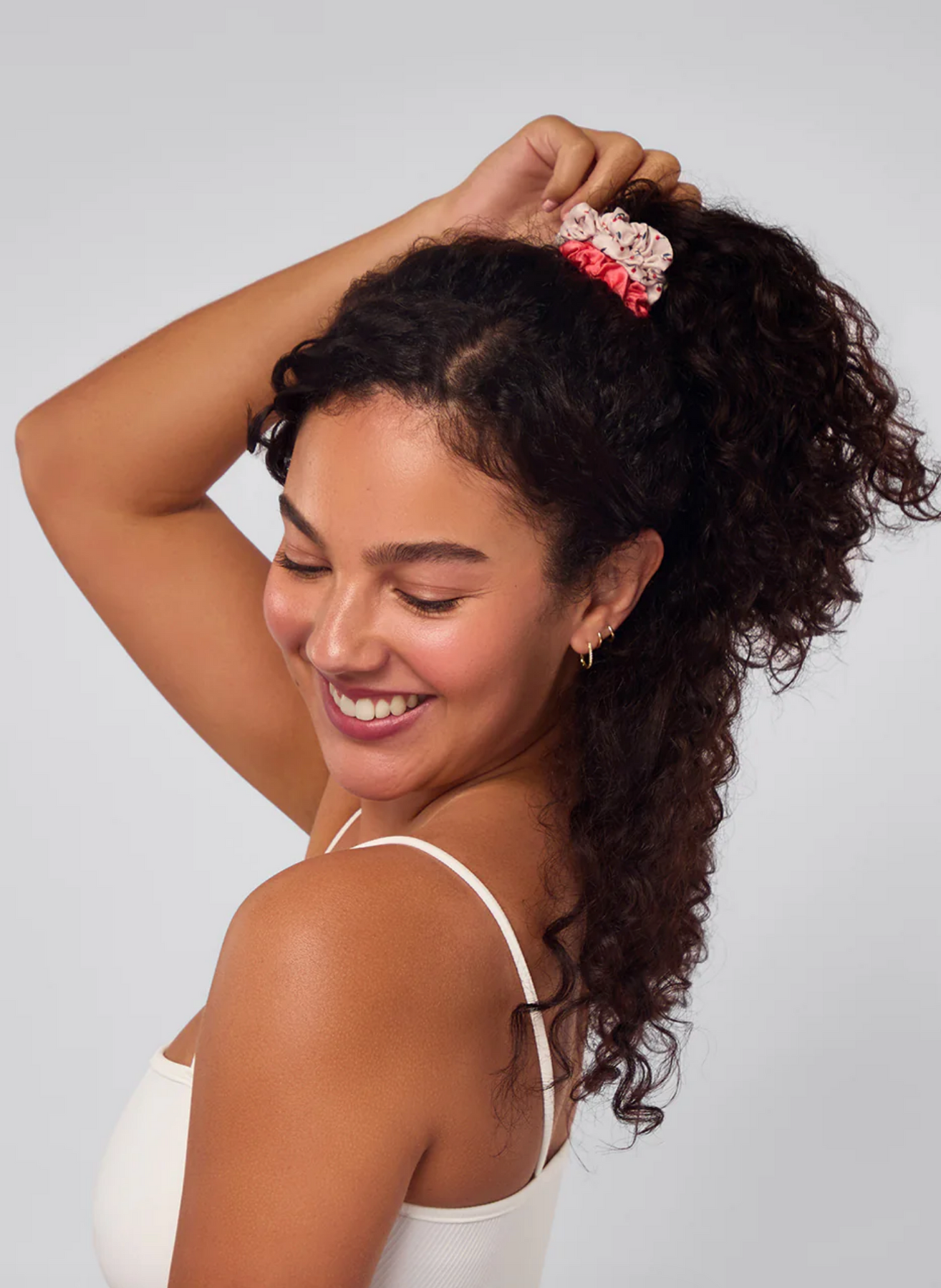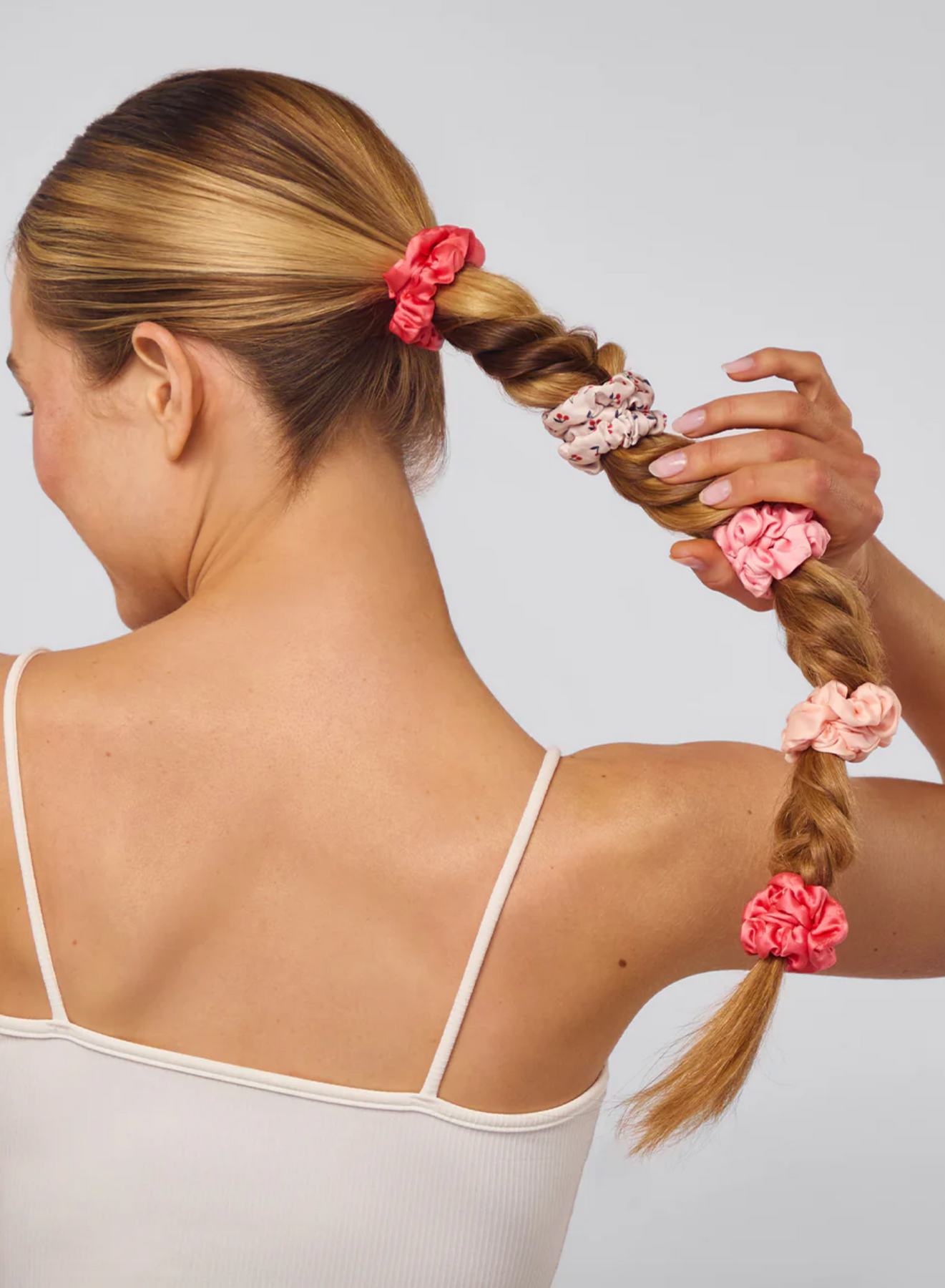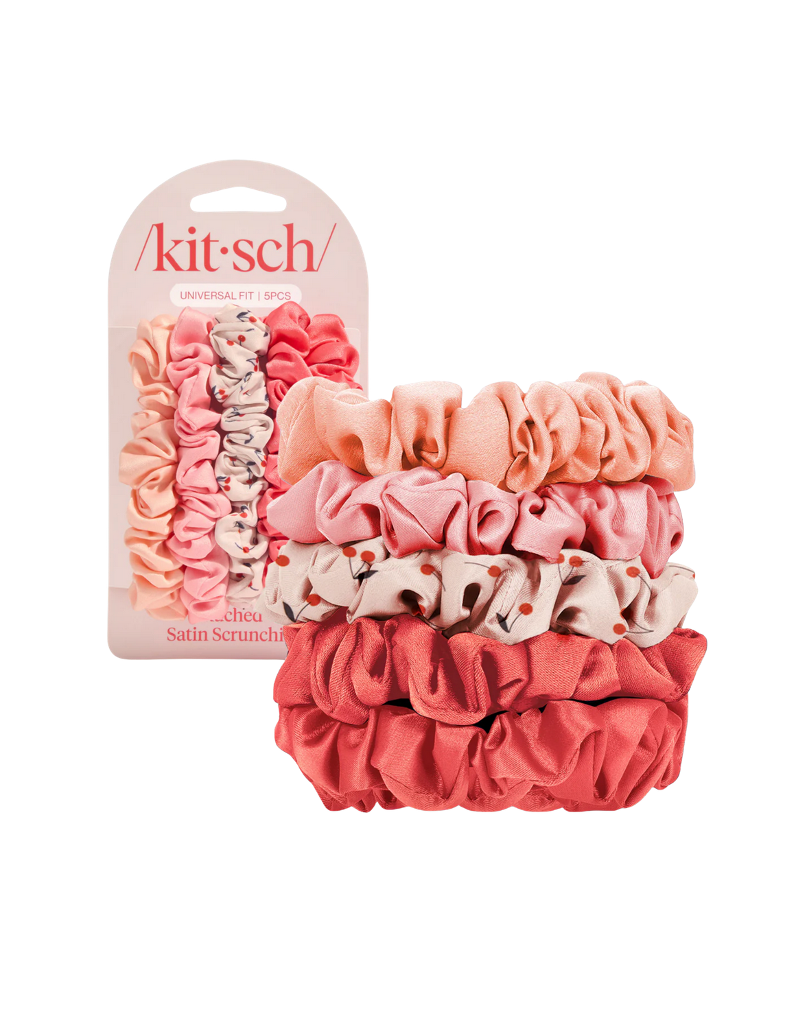 • Each package includes five satin scrunchies in assorted cherry-inspired and neutral tones.