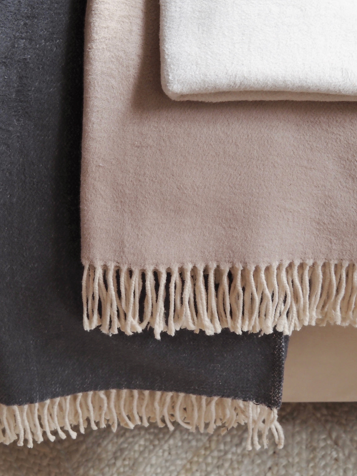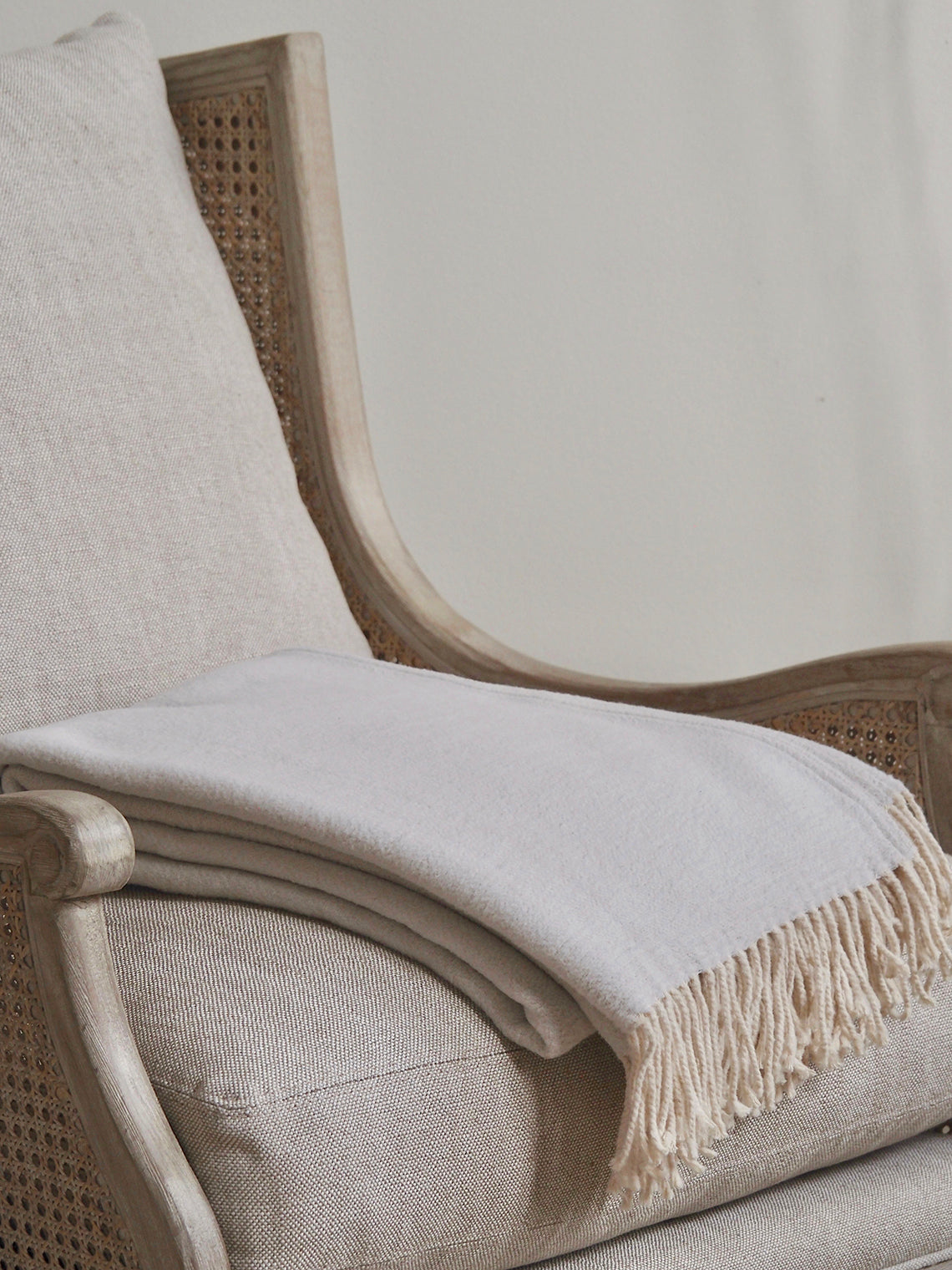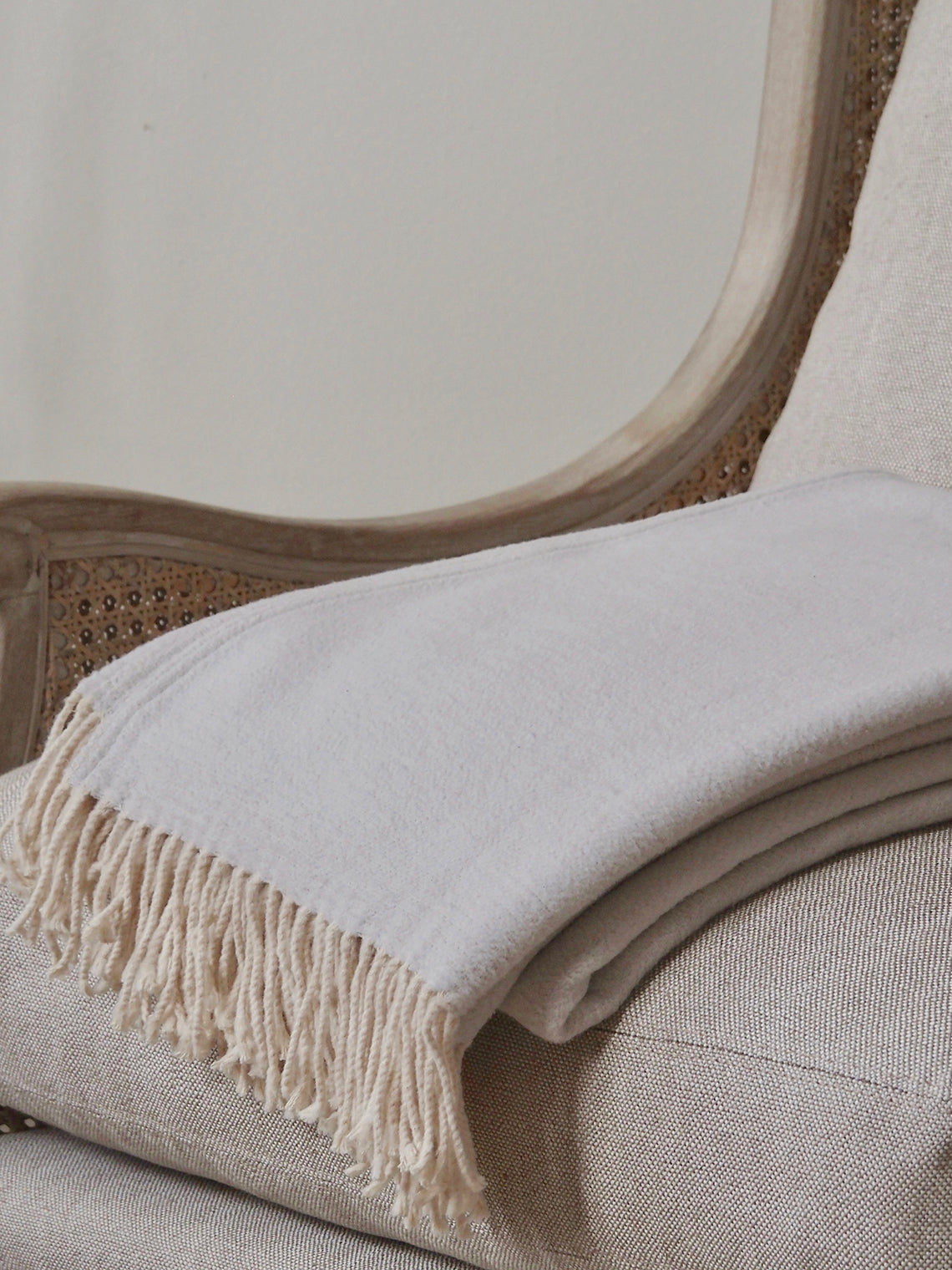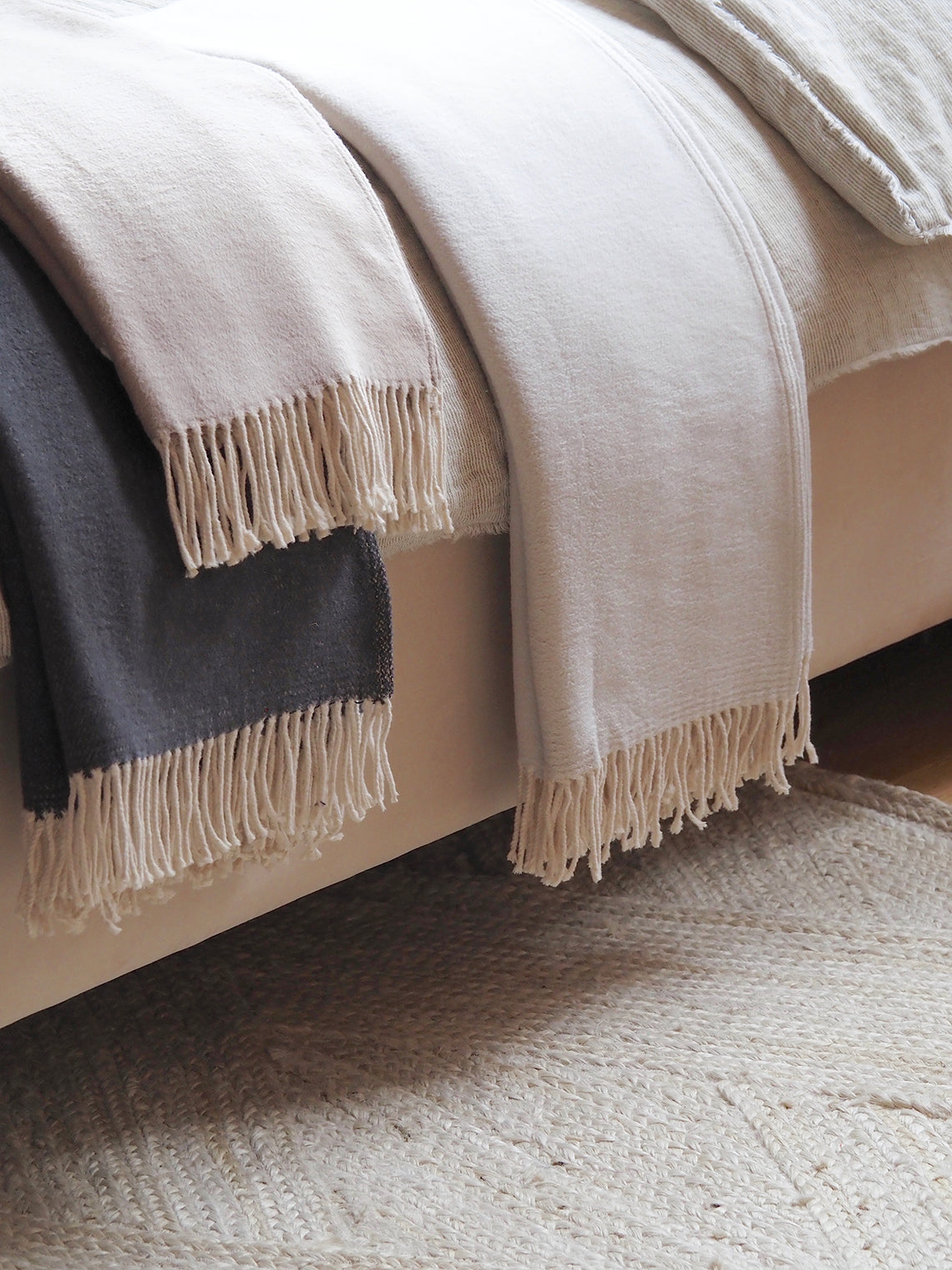 Cozy combed cotton throw in 3 beautiful colours with a soft ivory interwoven weave ending in tassels. Can't get any cozier than that!