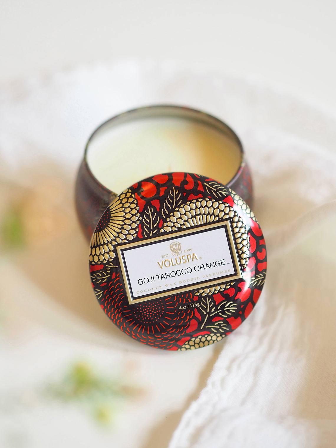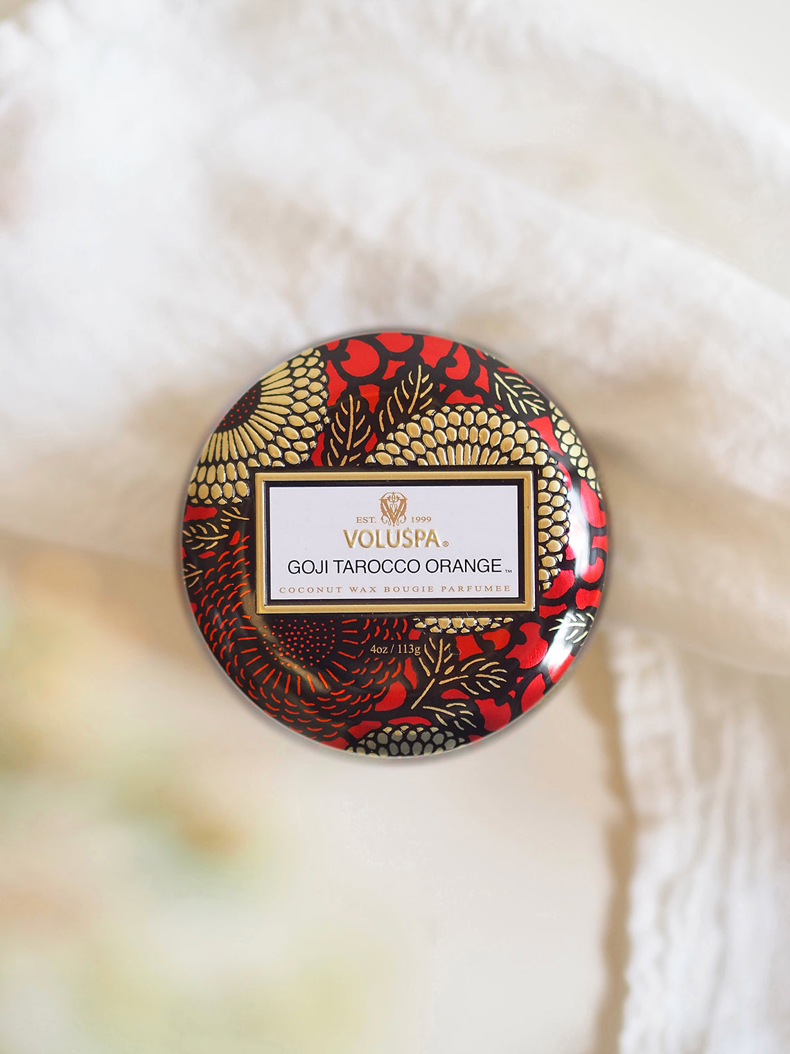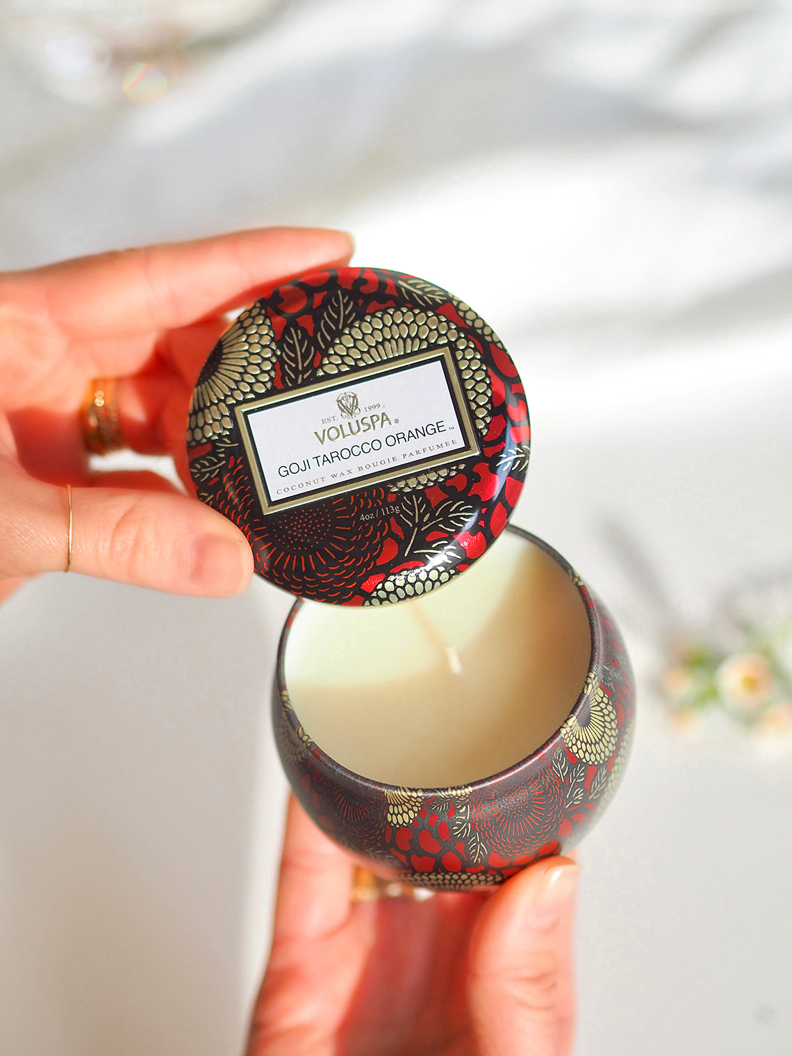 The perfect size to pepper throughout a room! As enchanting as the aroma itself, this tin features bold colours swirling across the Japanese-inspired designs.