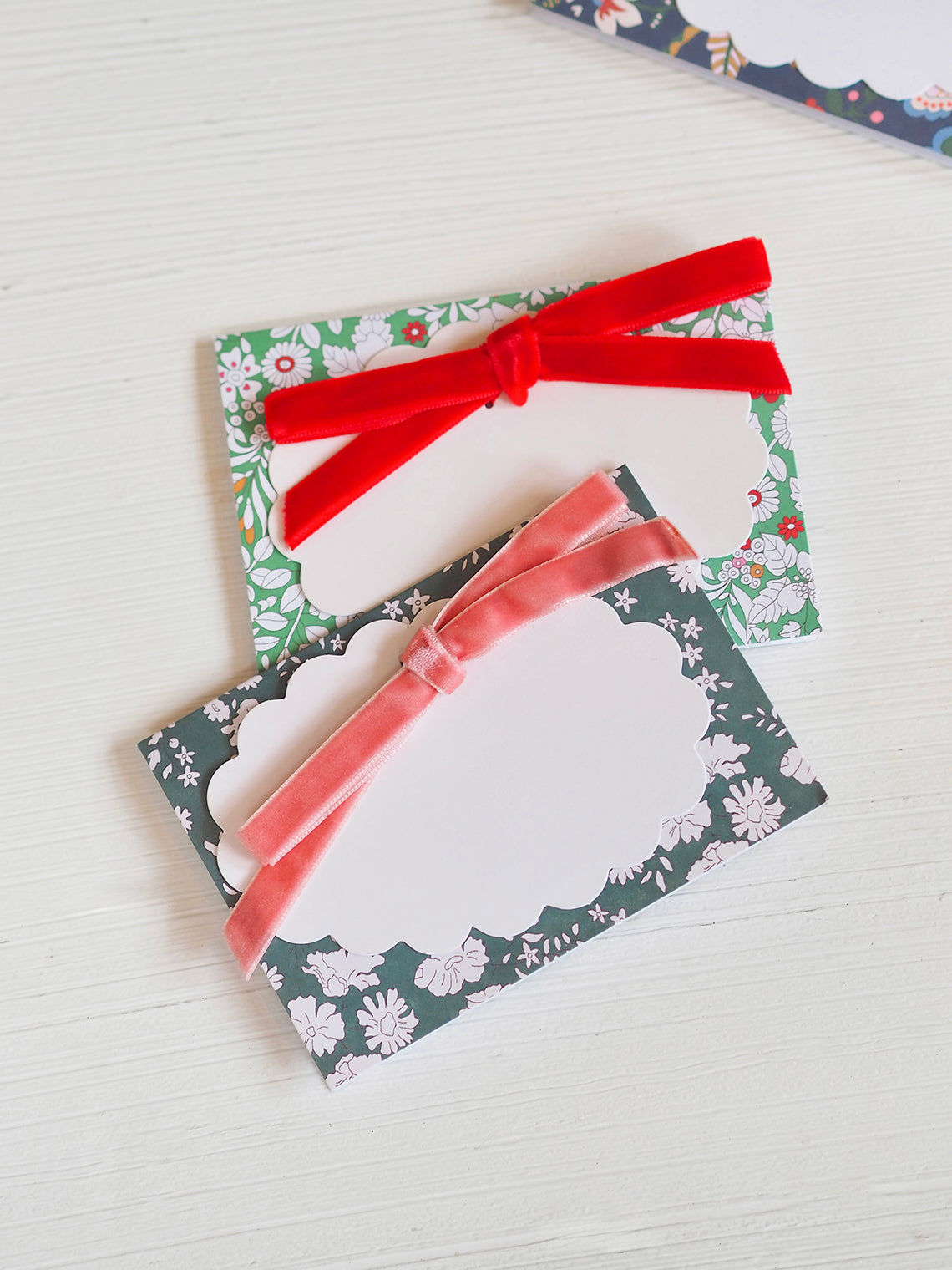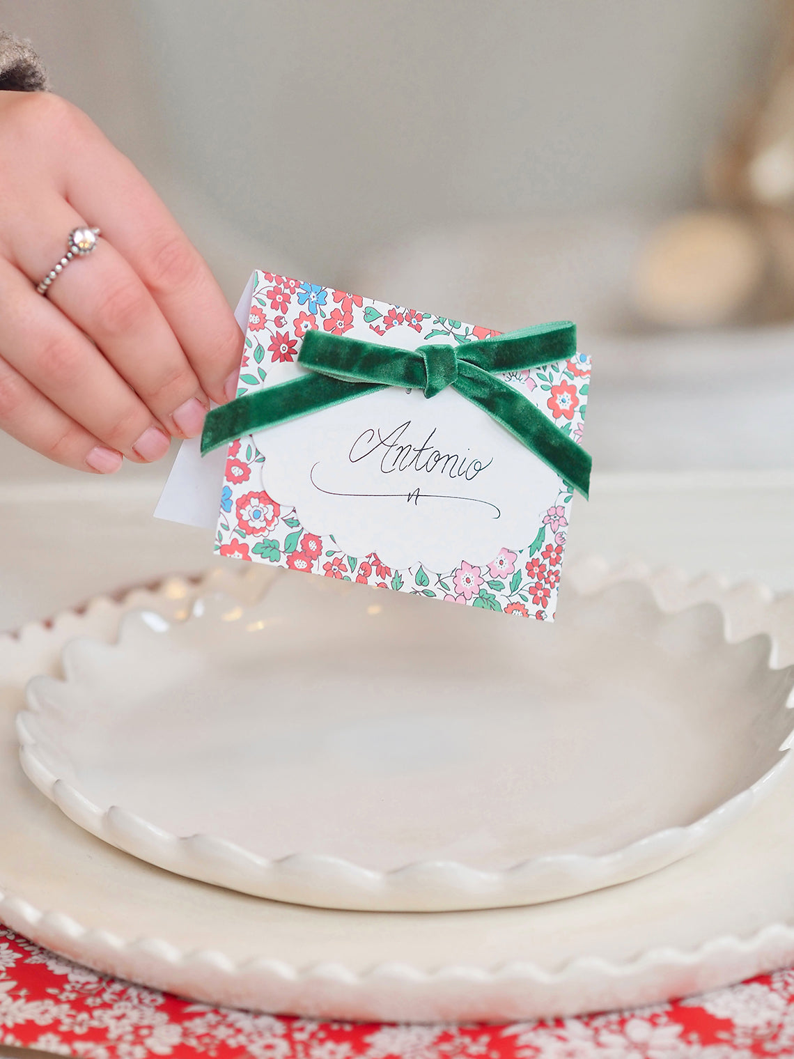 Meri Meri has collaborated with Liberty to create an elegant Christmas dinner party style. These paper place cards, featuring floral Liberty prints and soft velvet bows in a joyful, festive palette, create a sophisticated tablescape with a touch of timeless charm. Pale matte gold foil accents and scalloped paper tags for personalization bring a chic touch. A perfect conversation starter as guests find their seats! We've also included extra tags, so you can reuse these cards again and again throughout the season and beyond.