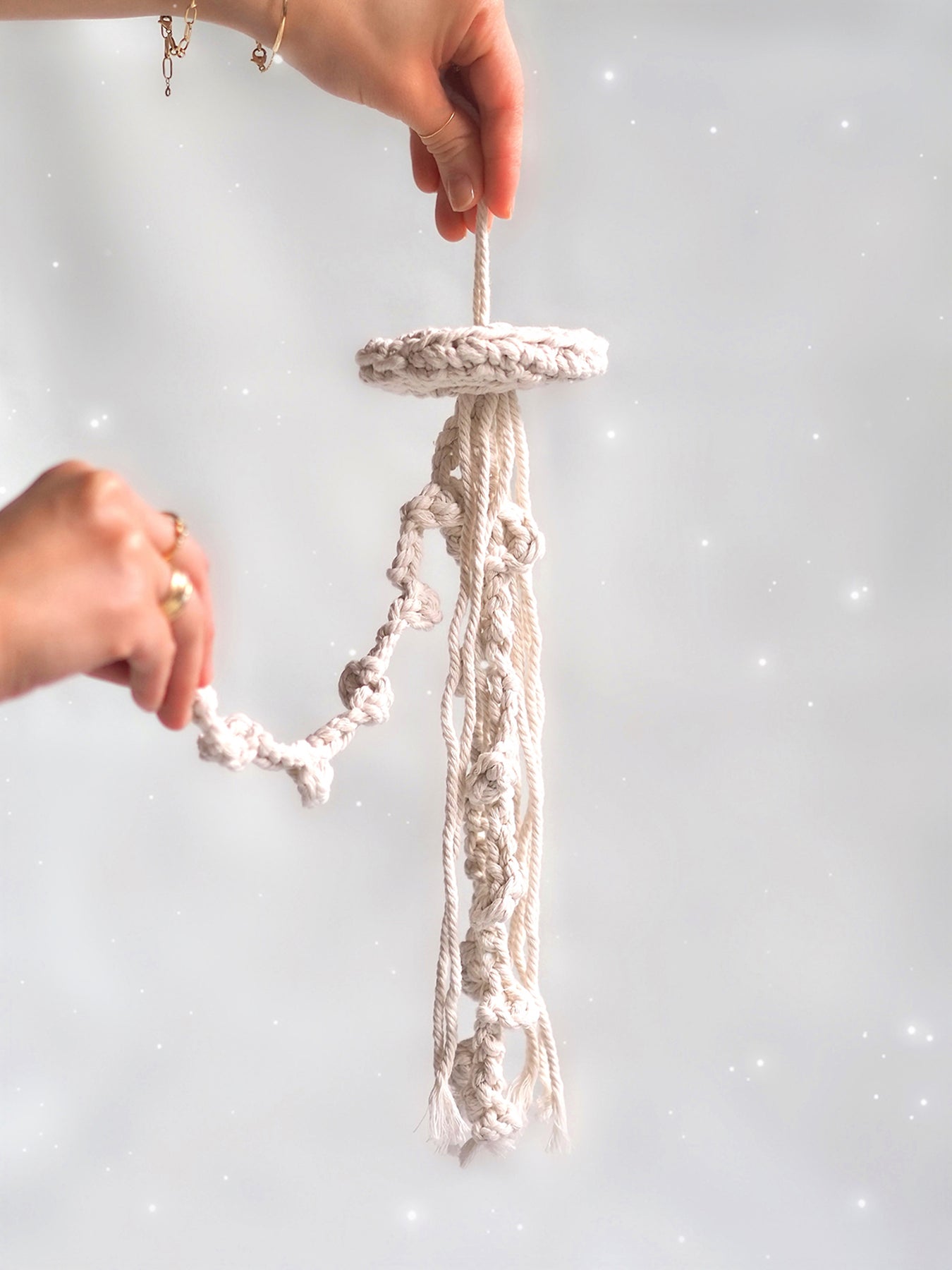 A unique way to show off your style! This cotton macrame jellyfish ornament is a unique and enchanting addition to any collection. Measuring 6 inches round and 27.5 inches high, it's a handcrafted treasure that captures the delicate flow of a jellyfish. Whether it's part of a festive display or a year-round decoration, this ornament is sure to bring a touch of ocean tranquillity to the home.
