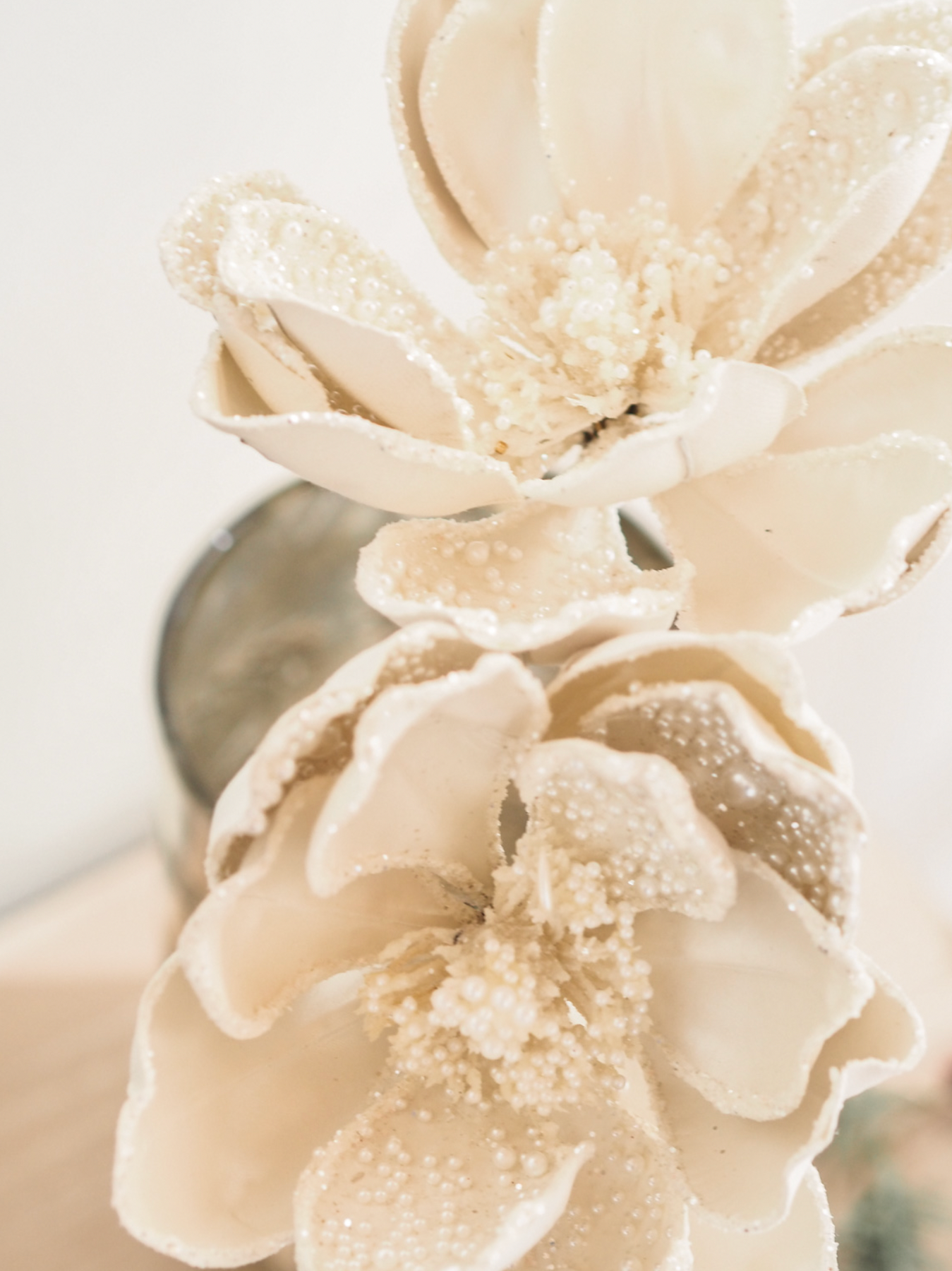 A stunning faux magnolia bloom adorned with delicate pearl beading and shimmering accents. Perfect for holiday arrangements, elegant centerpieces, or adding a touch of refined sparkle to your seasonal décor.