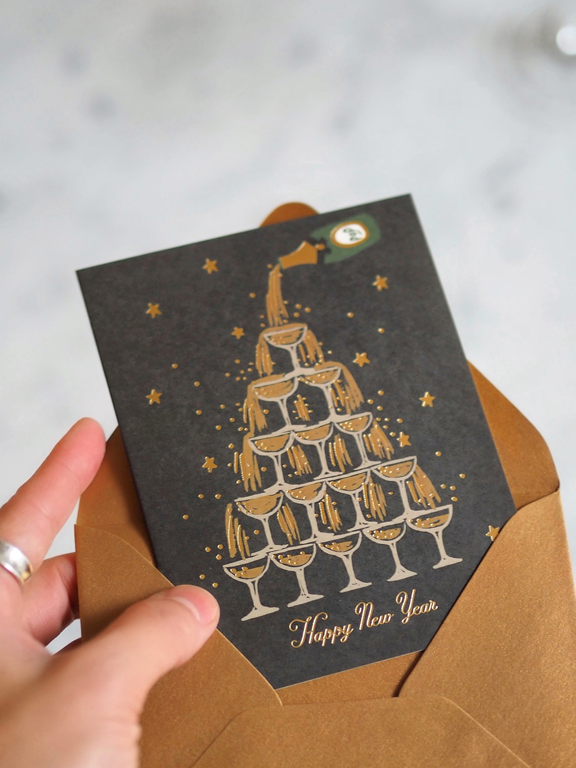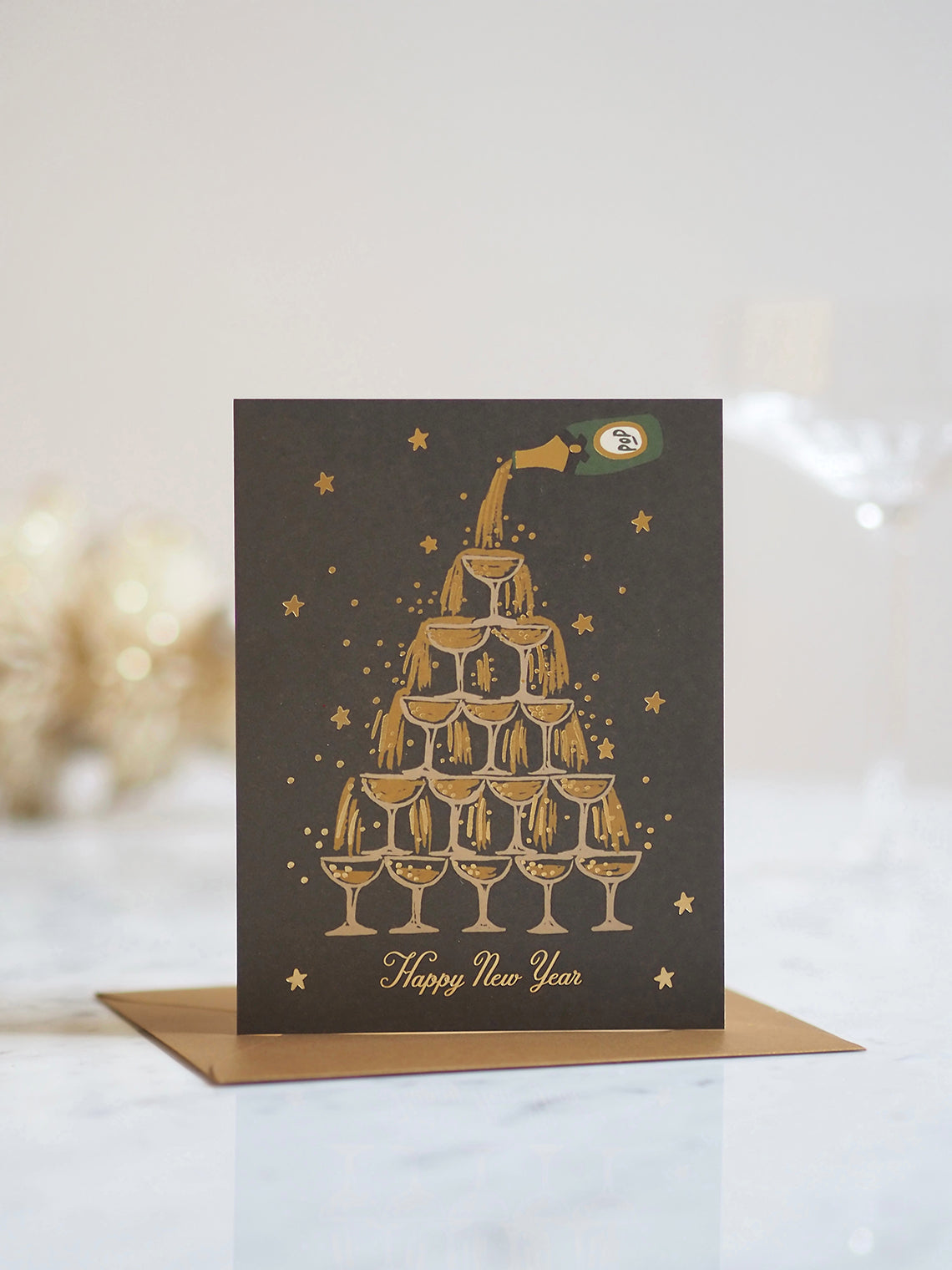 Wish your loved ones a happy New Year with this glittering, gold-accented greeting card. A blank interior lets your handwritten notes take center stage.