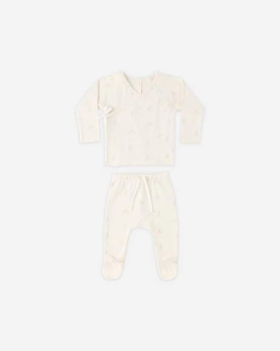 Bring home baby in this sweet set! Featuring a long sleeve wrap top with inside snaps and side tie, and matching drawstring footed pants.
