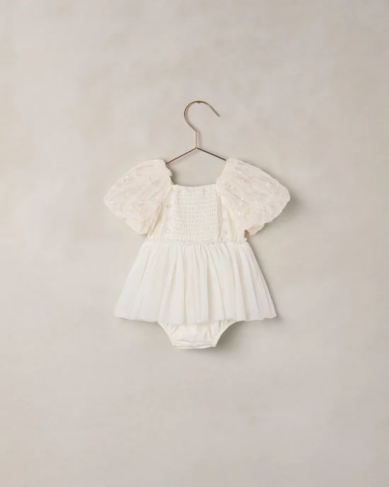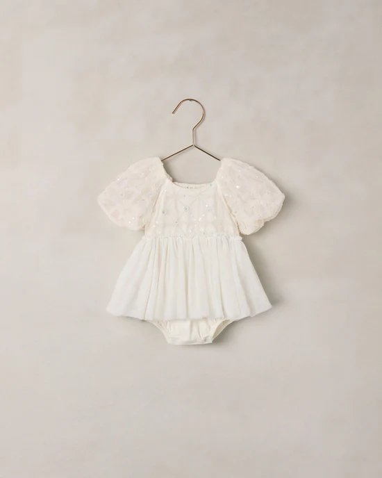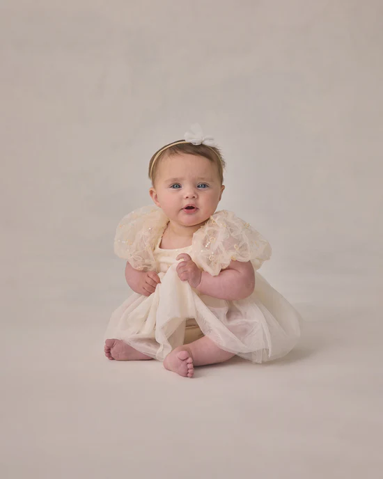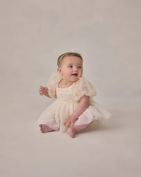 The Dorothy Ivory Tutu Dress features a delicately embellished mesh bodice with smocking at the back, full puff sleeves in airy tulle, and a soft jersey liner with bottom snaps for comfort and easy wear. With its whimsical sparkle and fairytale charm, it’s a picture-perfect choice for holiday celebrations and special occasions!