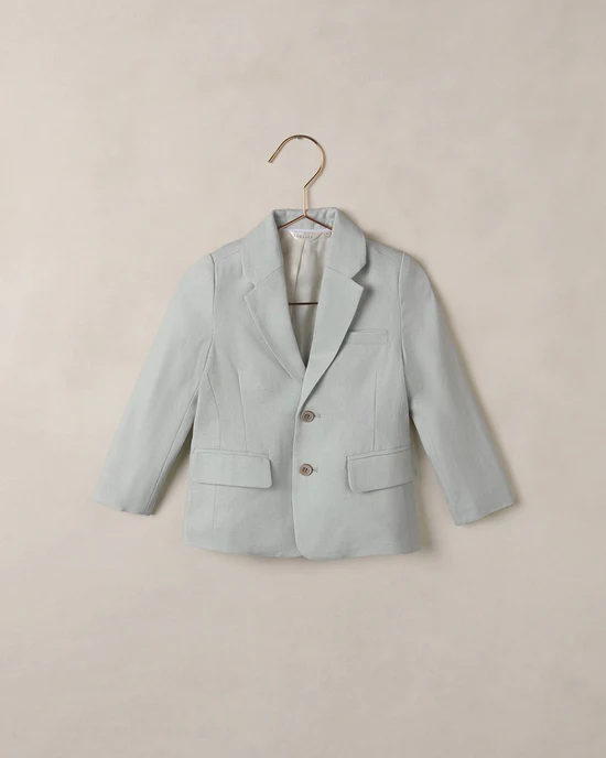 The Sebastian Mist Blazer is a single-breasted jacket in soft cotton melange fabric. It features notched lapels, marbled buttons, and pockets at the front, with a vent at the back.