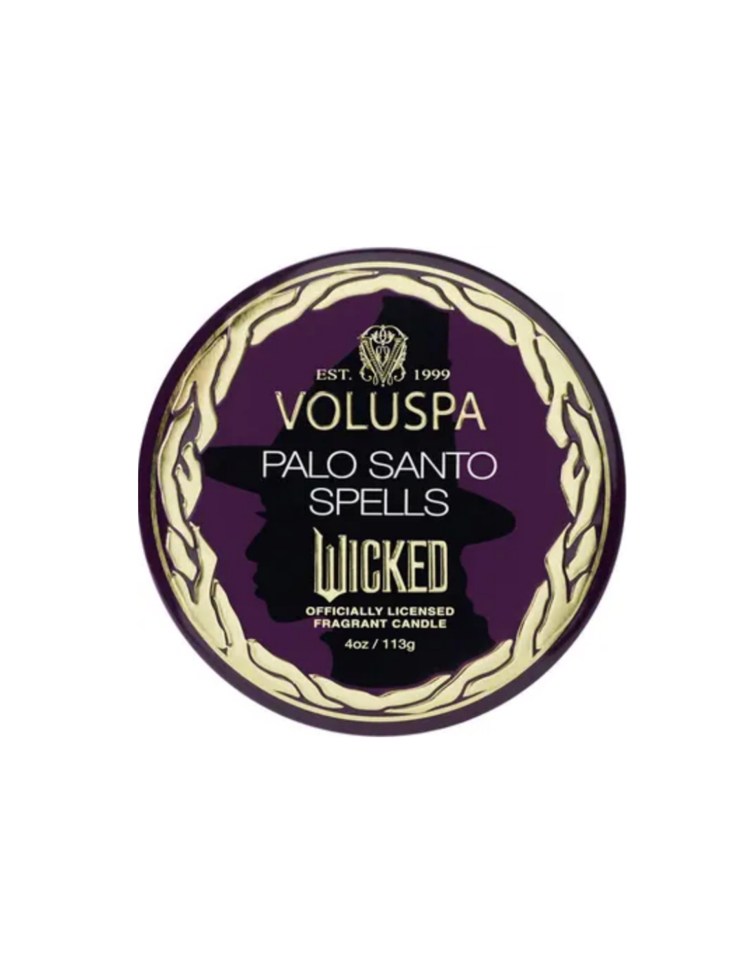 A richly dark purple decorative tin candle featuring Elphaba's silhouette inside of an embossed gold-patterned frame.